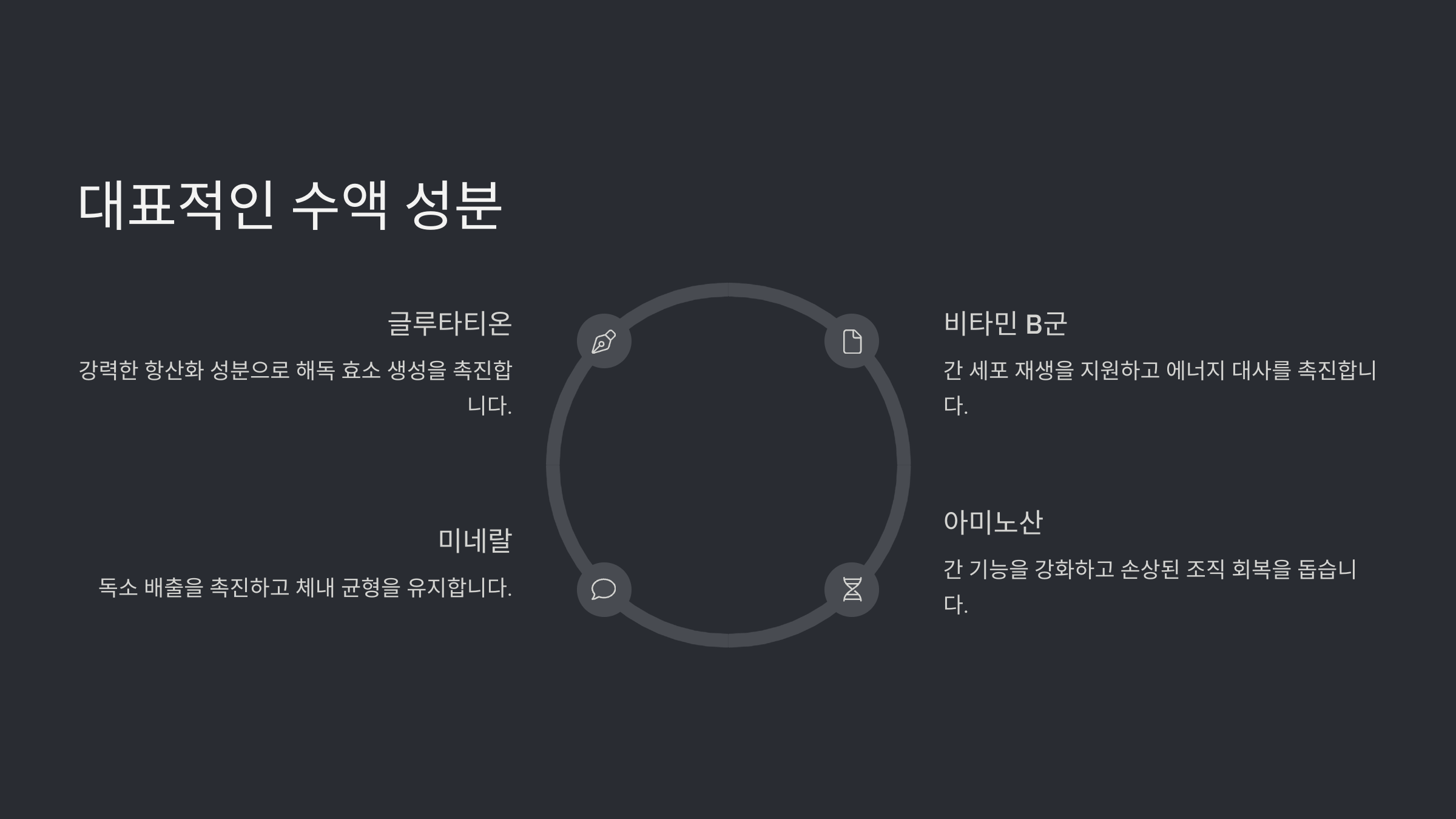 | 주요 성분 | 비타민 B, C, 포도당, 전해질 | 글루타치온, 실리마린, NAC |