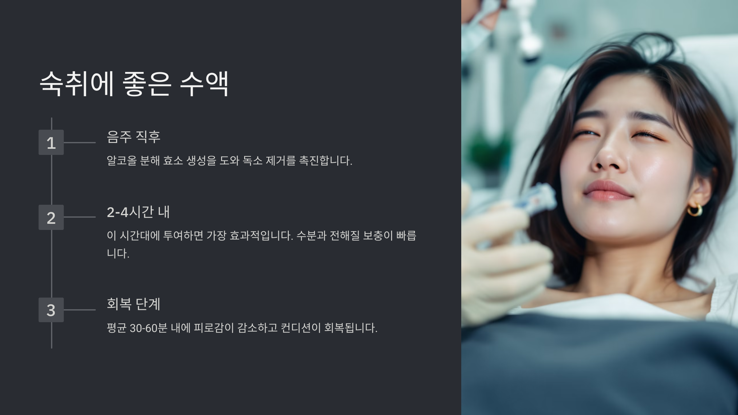 특히 전해질 수액은 술로 빠져나간 체내 수분과 미네랄을 보충해줘서 두통, 어지러움, 탈수 증상을 줄이는 데 효과적이에요. 알코올 대사로 생긴 아세트알데히드를 분해하는 데도 도움이 된답니다.