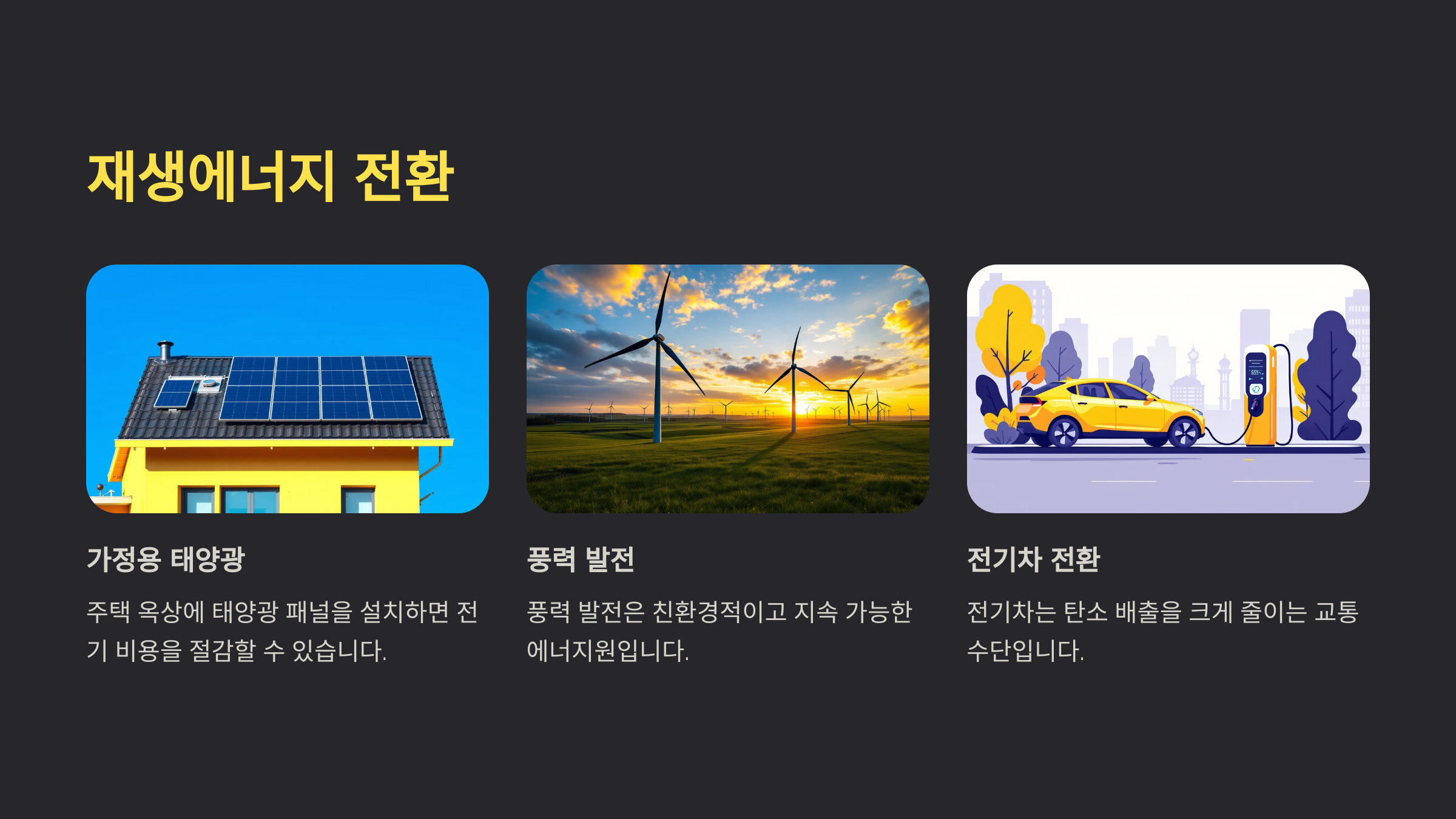 | 에너지 절약 | 전기 사용 줄이기, LED 전등 사용 | 가정 CO₂ 배출 감소 |
