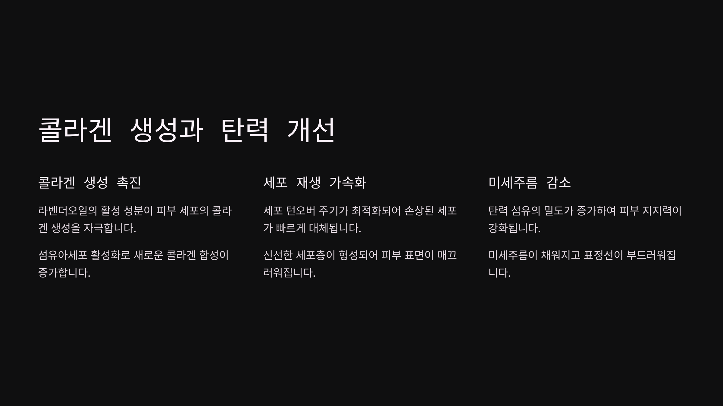 피부 탄력은 나이가 들수록 자연스럽게 감소해요. 진피층의 콜라겐 생성이 줄어들고, 피부는 힘없이 처지게 되죠. 그런데 라벤더오일은 진피층 내 섬유아세포를 자극해 콜라겐 생성을 유도한답니다. 🧴