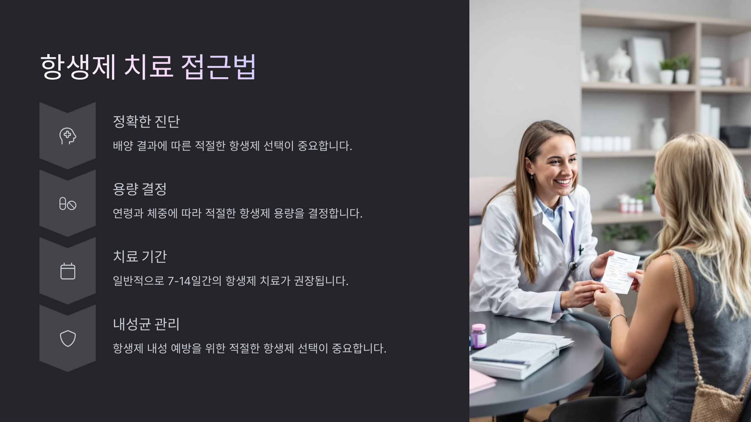 병원에서는 소변 배양 결과가 나오기 전까지는 경험적 항생제(예상 치료)를 먼저 사용하고, 결과가 나오면 감수성 검사에 따라 약을 바꿔요. 즉, 어떤 균에 어떤 약이 듣는지에 따라 조정하는 방식이죠.