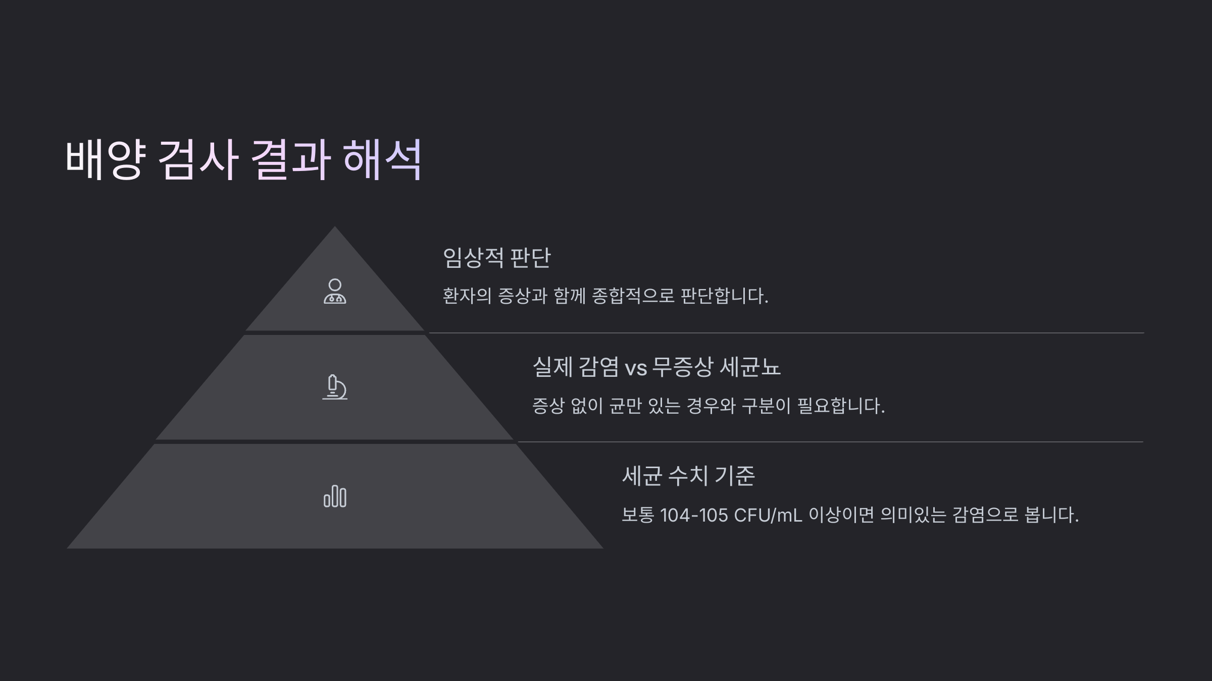 | 채뇨백 | ≥100,000 (의심됨) | 오염률 높아 증상 중요 |