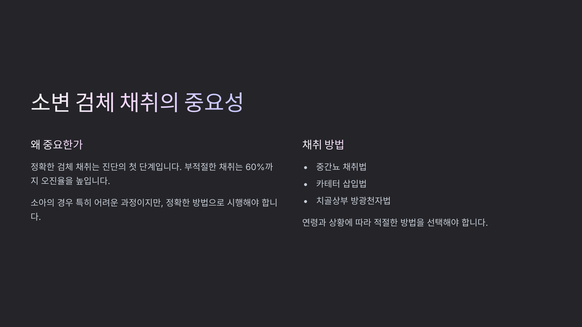 | 중간뇨 | 중간 | 간편, 정확도 괜찮음 | 소아 협조 필요 |