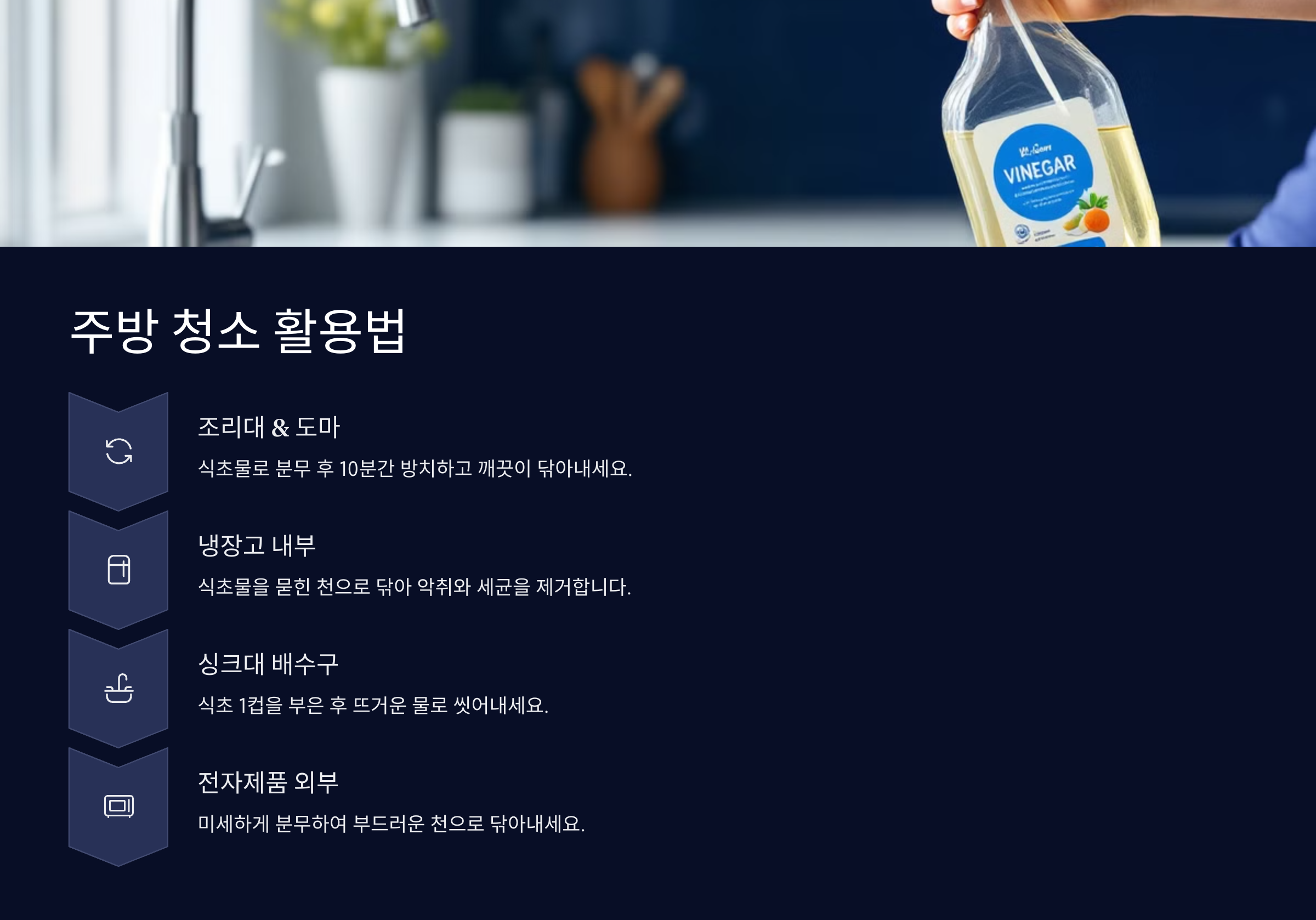 | 도마 | 식초물 뿌리고 10분 후 헹굼 | 고기/생선 후 특히 효과적 |