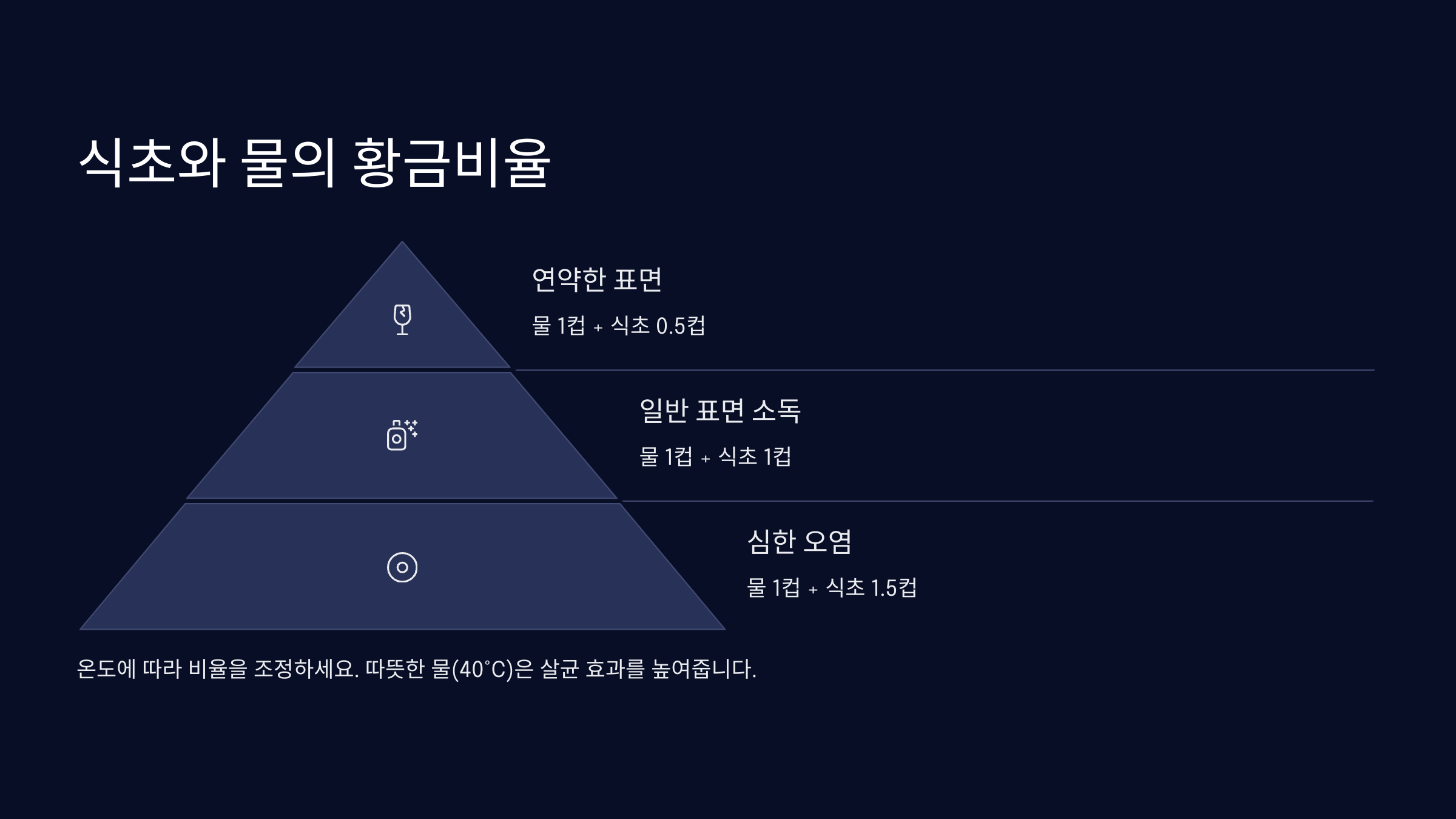 식초물은 비율에 따라 효과가 천차만별이에요. 너무 묽으면 살균력이 약하고, 너무 진하면 재질을 손상시킬 수도 있어서 정확한 비율이 중요하답니다. 일반적인 기준은 식초 1 : 물 3 또는 1 : 4 비율이 가장 널리 쓰여요. 이 정도면 세균 제거와 탈취, 곰팡이 억제에 고르게 효과적이에요.