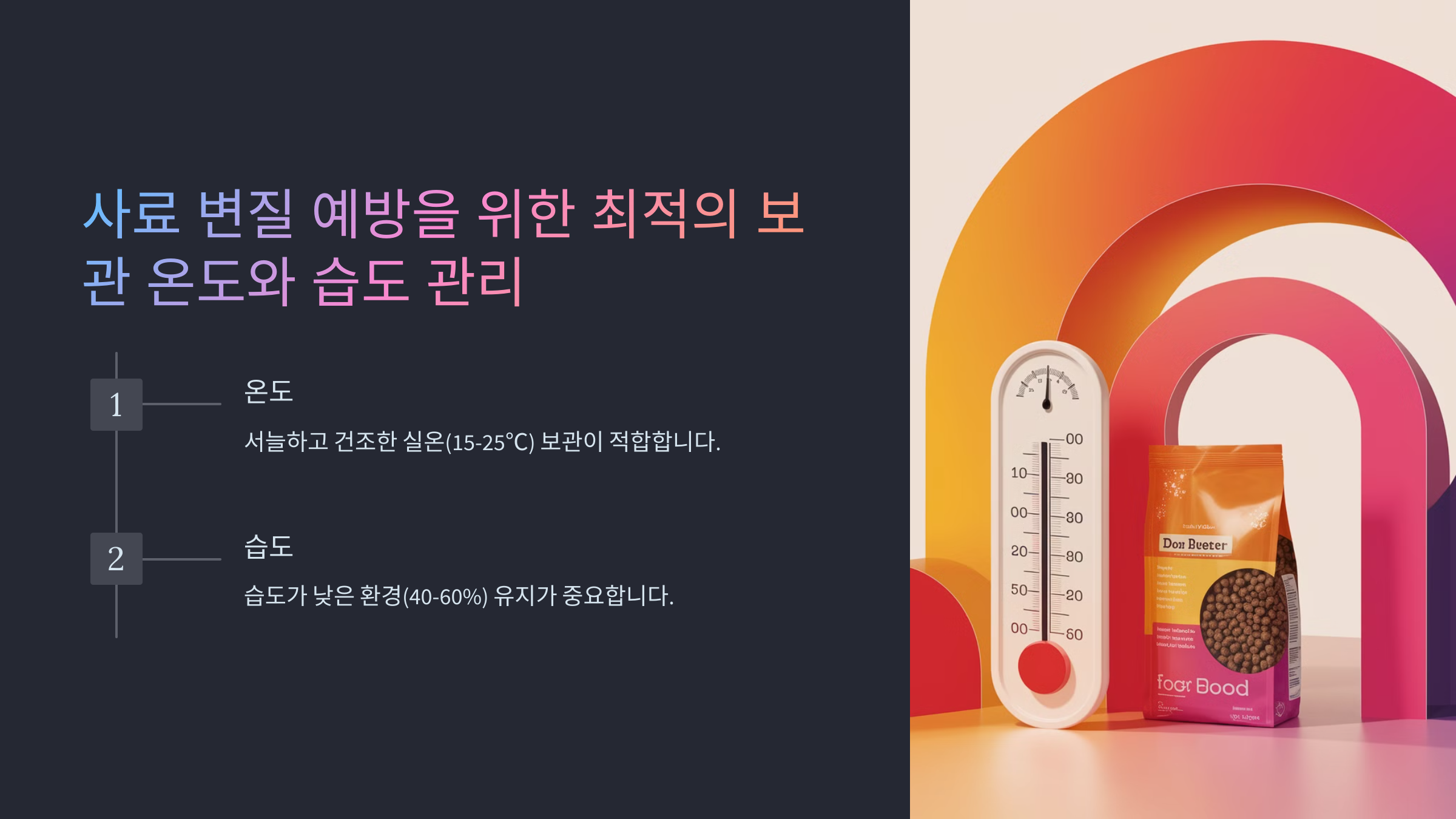 사료는 온도와 습도가 높은 환경에서 쉽게 변질될 수 있어요. 적절한 조건을 유지하면 사료의 신선도를 오래 보존할 수 있답니다! 🐕🐈