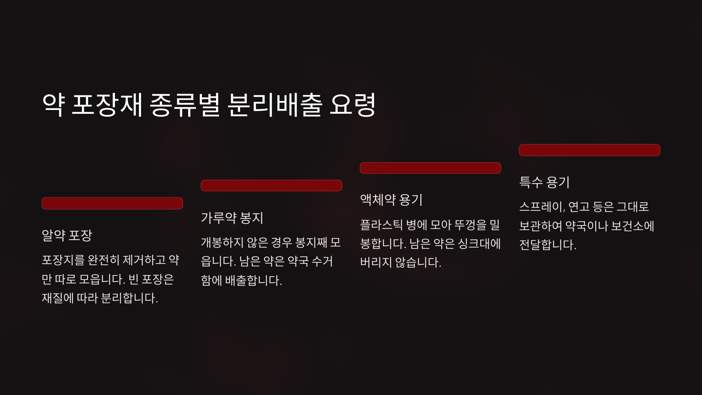 또한 가루약이나 액상약이 남아있는 경우, 약을 제거하고 포장재만 분리배출 해야 해요. 약 성분은 하수구로 흘려보내면 안 되고, 가까운 약국이나 보건소에 설치된 폐의약품 수거함에 버리는 것이 환경을 위한 바른 선택이에요. 🌍