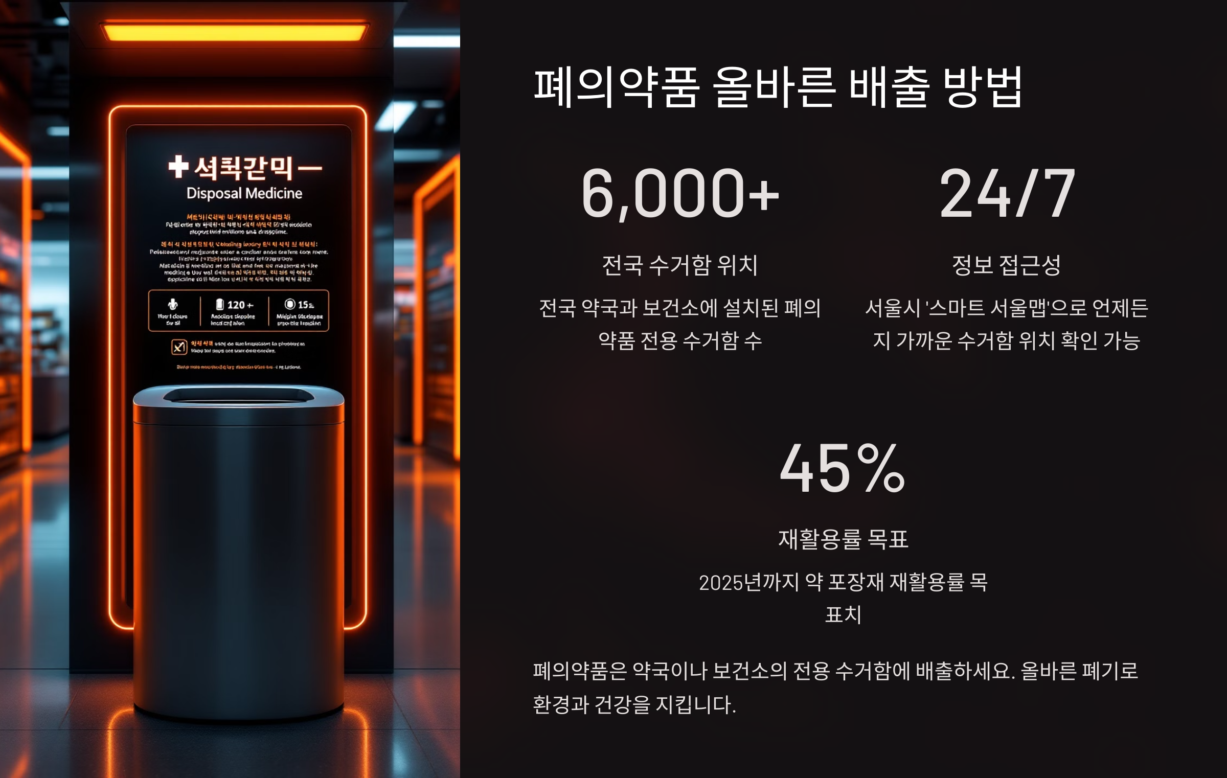 그렇다면 어떻게 버려야 할까요? 잔여 약물은 가장 좋은 방법으로 **약국이나 보건소에 설치된 폐의약품 수거함에 버리면 돼요.** 보통 약국 입구 근처나, 보건소 로비에 마련되어 있으니 근처에 들를 때 꼭 챙겨서 버려보세요.