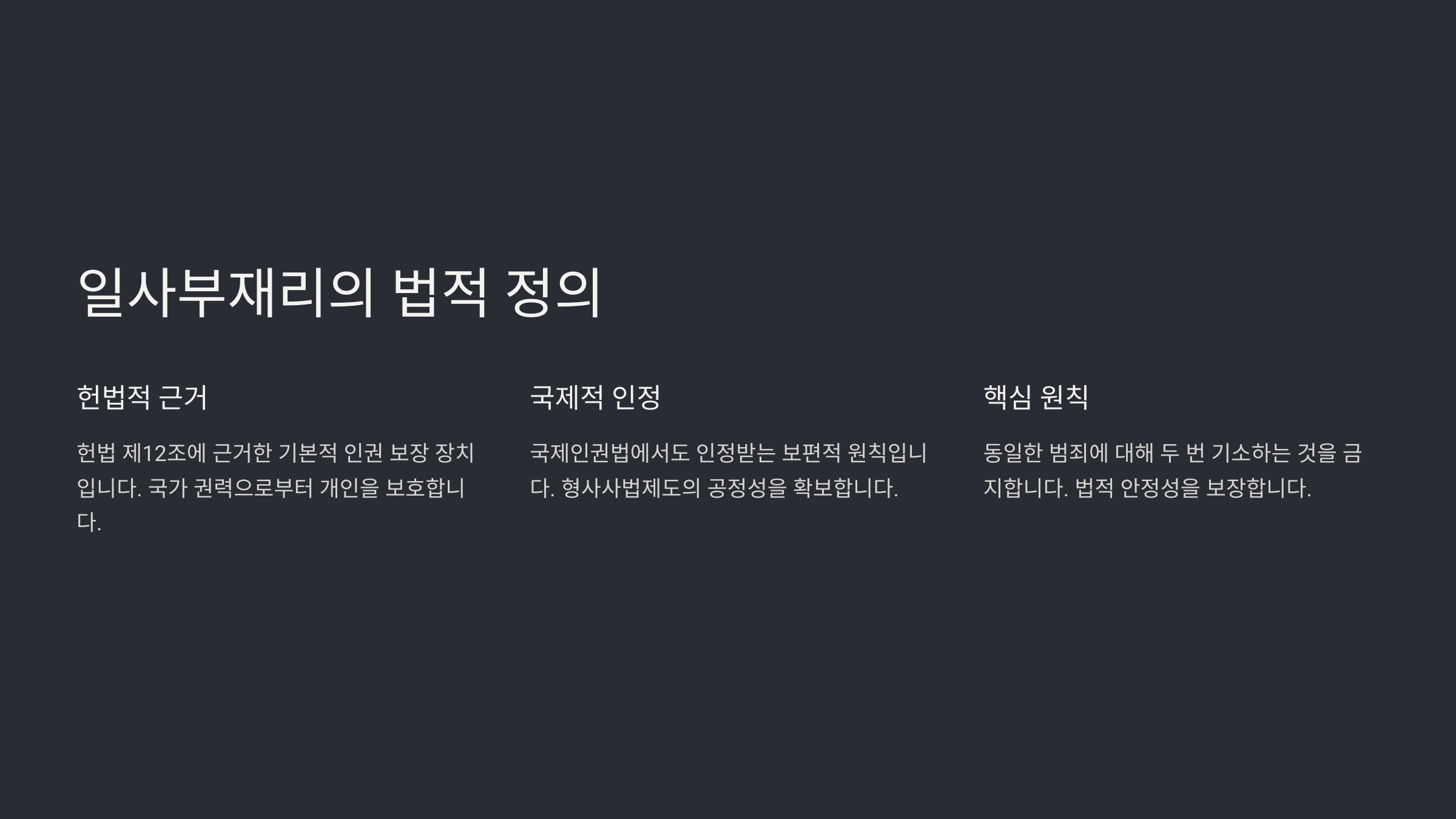 이 개념은 국제적으로도 중요한 인권 원칙이에요. 국제인권규약인 ‘시민적 및 정치적 권리에 관한 국제규약(ICCPR)’ 제14조 7항에서도 같은 원칙을 보장하고 있어요. 이미 무죄를 받거나 처벌받은 사건으로 다시 재판받지 않게 보호하고 있죠. 🌍