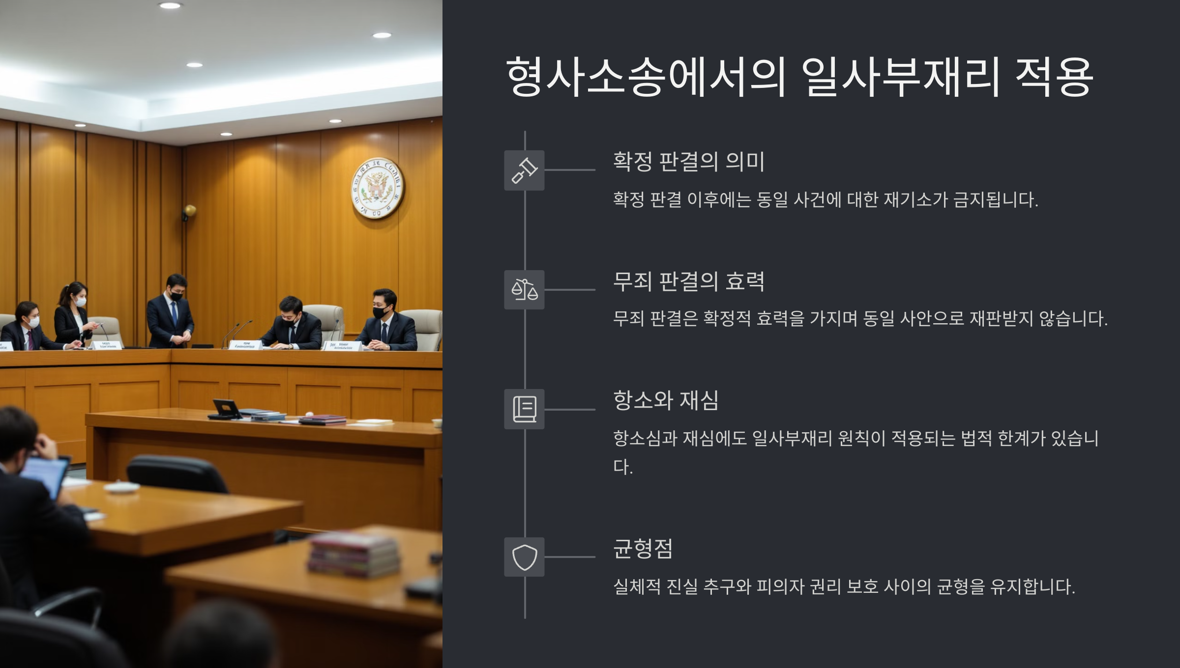 또 하나 중요한 점은 공소가 제기된 이후 판결이 ‘실질적 판단’에 도달해야 일사부재리가 적용된다는 거예요. 예를 들어 법원이 절차적인 사유로 공소기각을 결정한 경우에는 동일 사건으로 다시 기소될 수 있어요. 즉, 재판에서 내용 판단이 있어야 이 원칙이 적용된다는 점, 꼭 기억해두세요. 📎