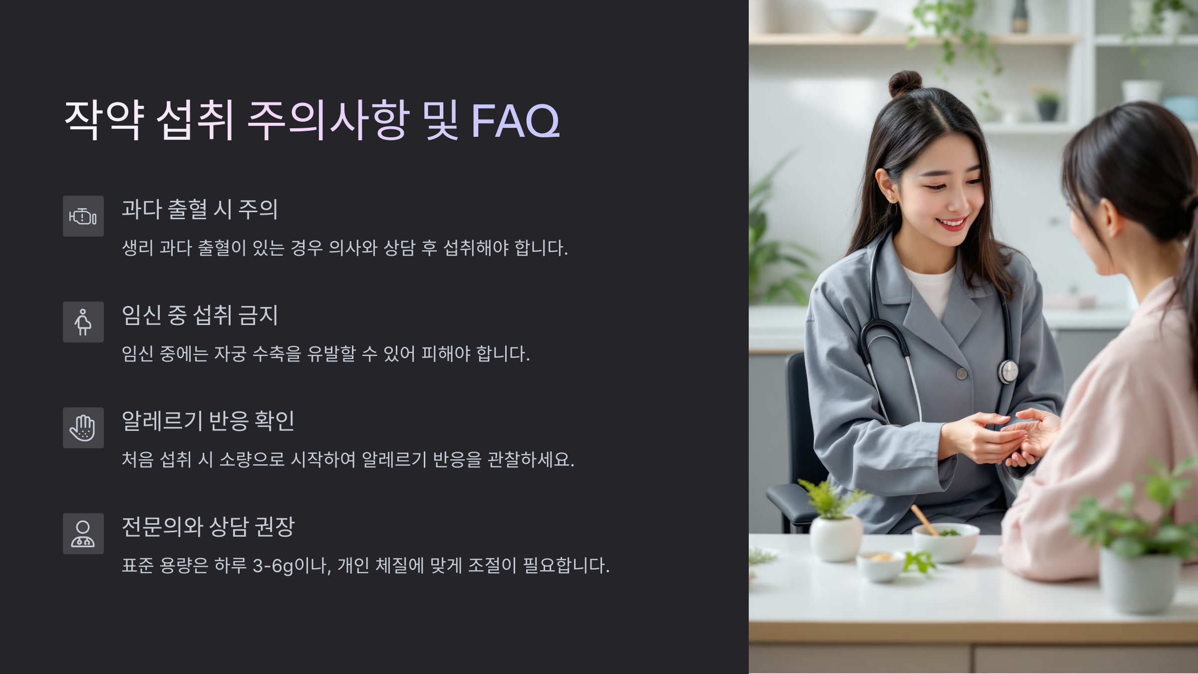 혹시 복용 후 알러지 반응(두드러기, 입술 붓기 등)이 나타난다면 즉시 복용을 중단하고 전문의와 상담해야 해요. 드물지만 약초에 민감한 사람에겐 이런 부작용도 생길 수 있답니다.