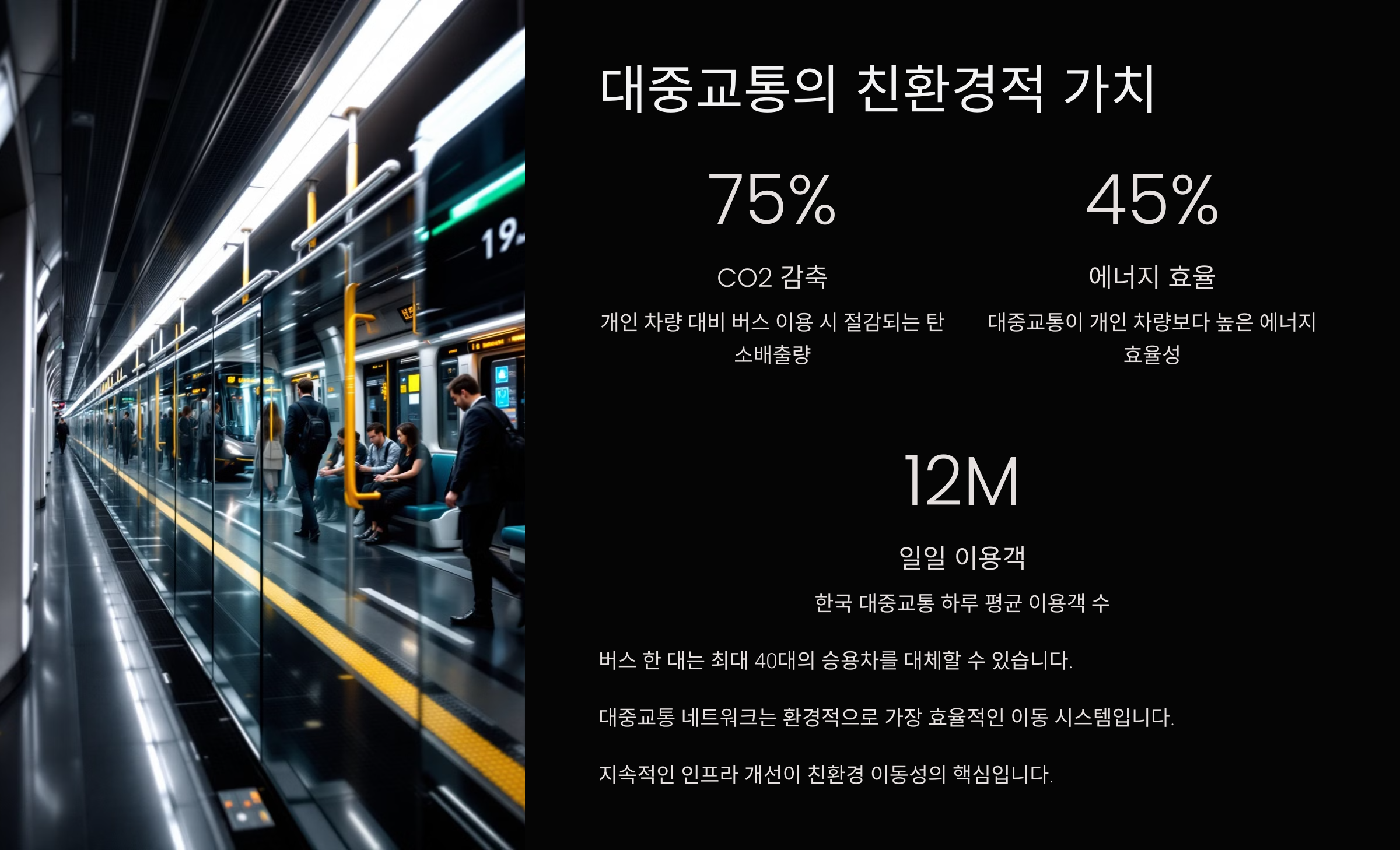 무엇보다도 대중교통은 '공공성'이라는 개념과도 맞물려 있어요. 개인의 이익보다 모두가 함께 쓰는 공공재라는 점에서, 환경뿐만 아니라 사회적 가치도 동시에 실현할 수 있어요.