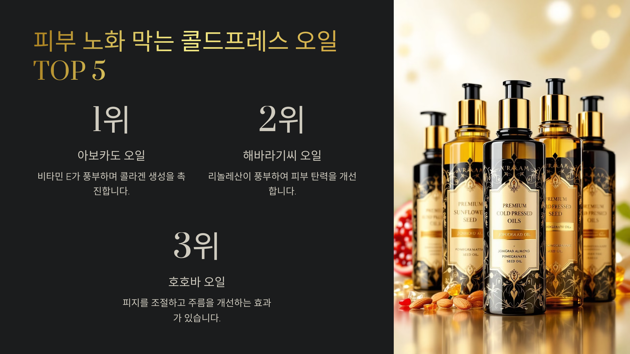 피부를 젊고 탱탱하게 유지하려면 어떤 오일을 선택하느냐가 정말 중요해요. 콜드프레스 방식으로 짜낸 오일 중에서도 노화 방지에 특히 좋은 오일들이 있어요. 피부에 직접 바르거나 식단에 추가하면 세포 재생과 수분 유지에 탁월한 효과를 볼 수 있어요. 지금부터 하나씩 살펴볼게요! 😊