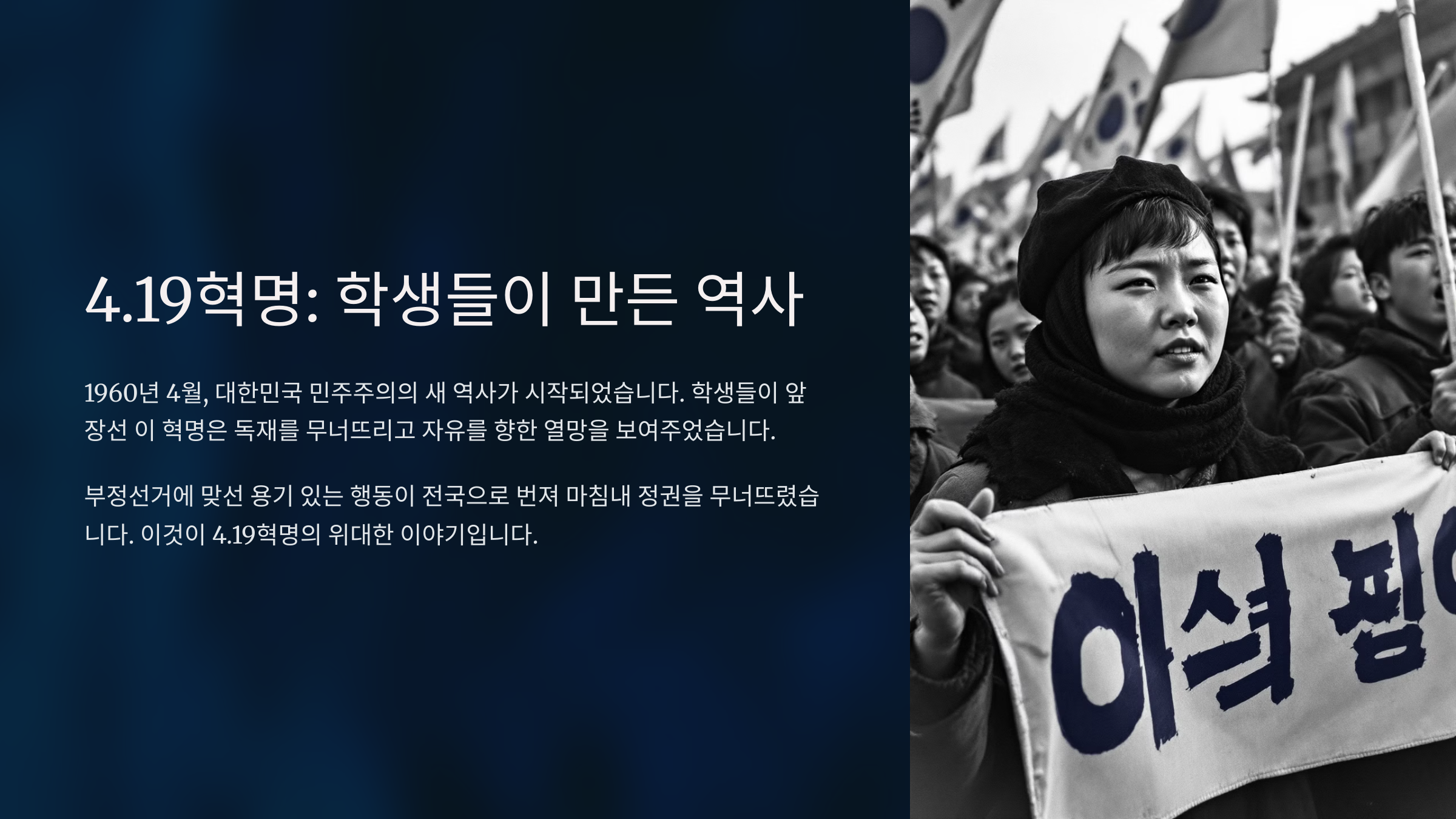 4.19혁명은 단순한 사건이 아니라, 민주주의를 향한 학생들과 시민들의 외침이 터져 나온 순간이에요. 특히 고등학생과 대학생들이 중심이 되어 이끌어간 이 운동은, 권위주의 정권에 맞서 싸운 국민 저항의 상징으로 남아 있어요.