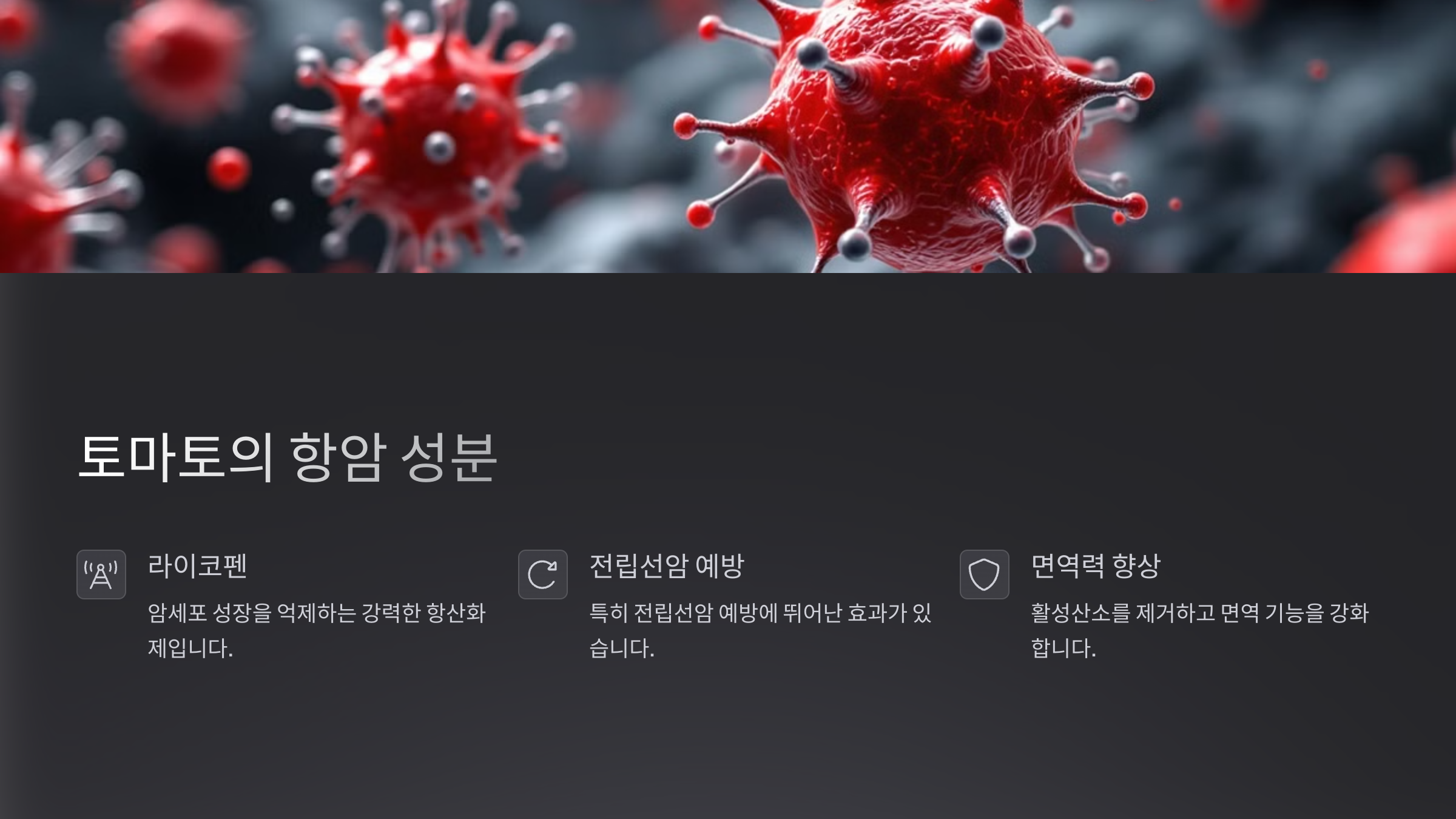 토마토에는 강력한 항염 물질인 '라이코펜'과 '베타카로틴'이 풍부해요. 이 두 가지 성분은 체내 염증을 낮추는 데 큰 역할을 하죠. 특히 항암 치료 중 생기는 구내염, 피부 트러블, 관절통 같은 염증성 증상 완화에 도움을 줄 수 있어요.