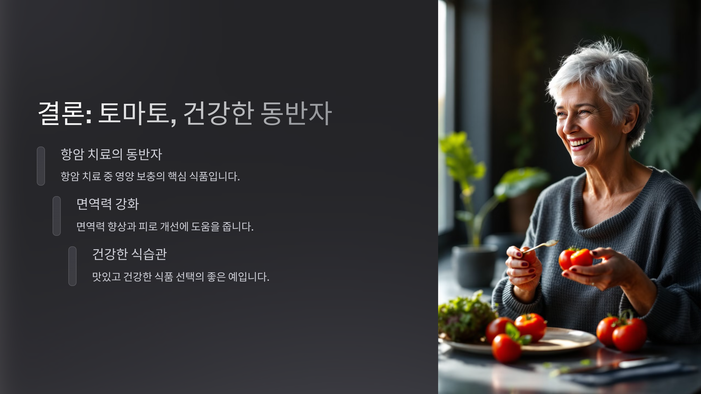 제가 생각했을 때 토마토는 ‘부작용은 줄이고, 체력은 올리는’ 자연 보조식품 같은 느낌이에요. 그래서 항암 치료 중인 분들이 부담 없이 즐길 수 있는 좋은 식재료라고 느껴요.