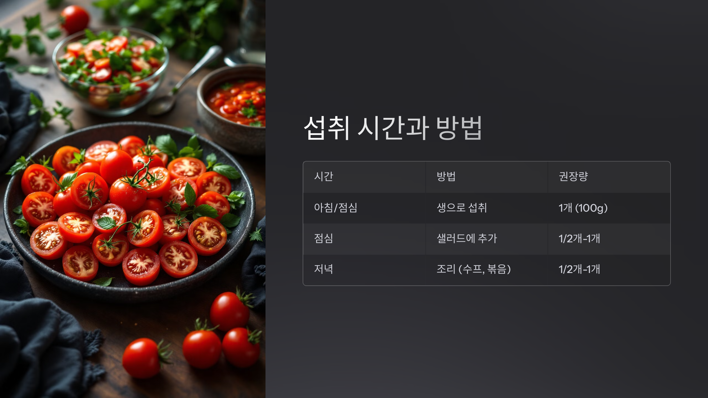 토마토는 오전 중 공복이나 식사 전후 30분 이내에 먹는 게 가장 좋아요. 이때 라이코펜과 비타민 C 흡수율이 높고, 소화도 훨씬 원활하답니다.