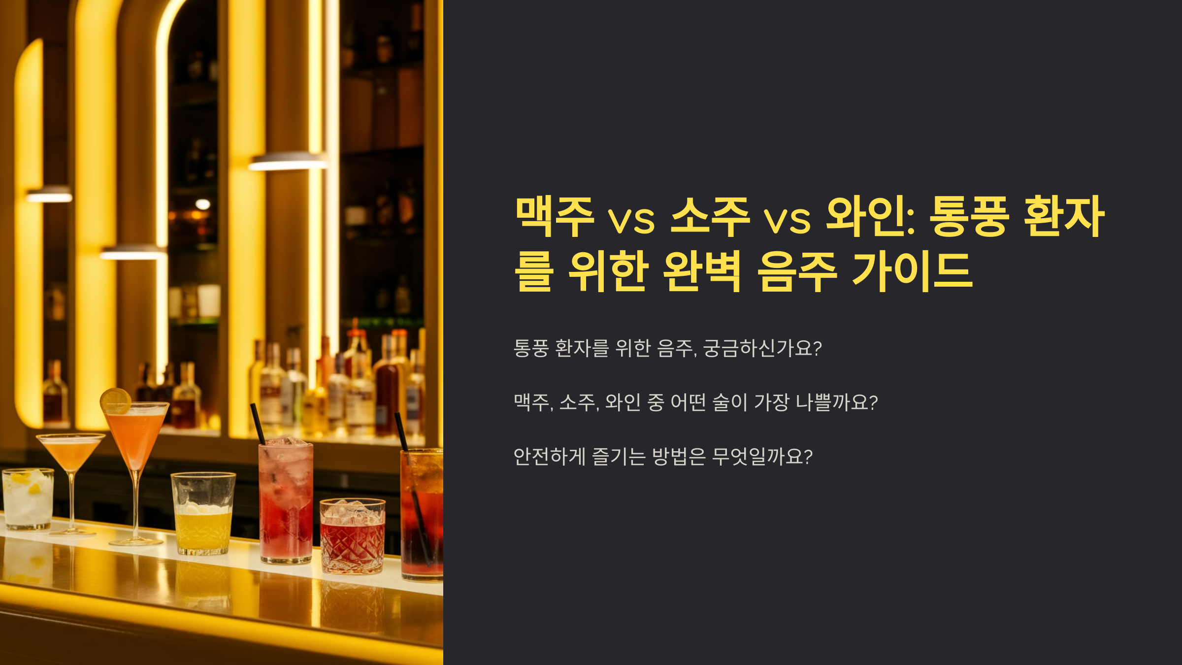 그렇다면, 어떤 술이 통풍에 더 나쁠까요? 다음 섹션에서 맥주, 소주, 와인을 비교해볼게요! 🍾