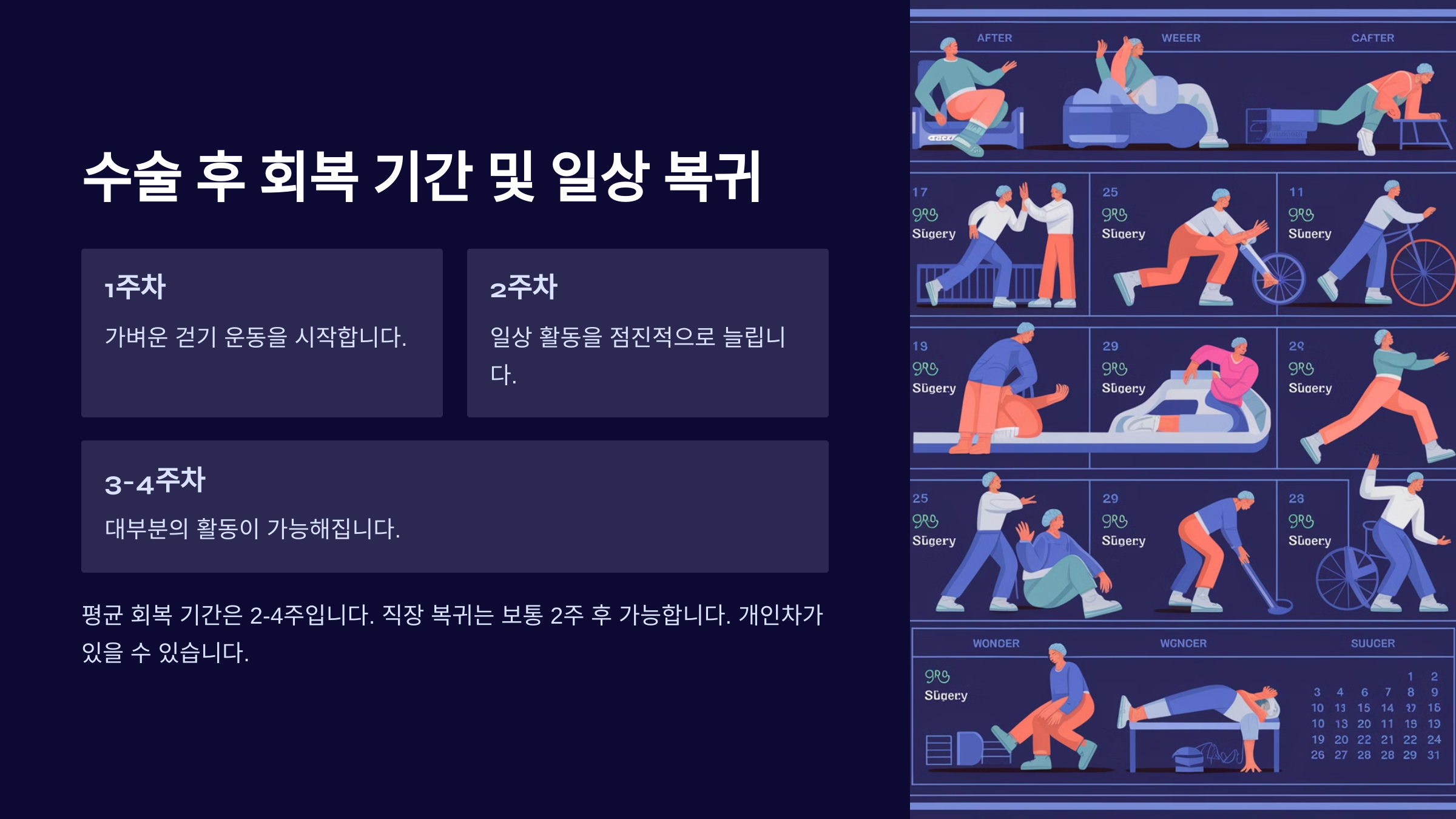 보통 **수술 후 1~2주는 조심해야 하고, 완전히 회복하는 데는 4~6주** 정도 걸려요. 하지만 가벼운 일상생활은 수술 후 며칠 내로 가능해요! 😊