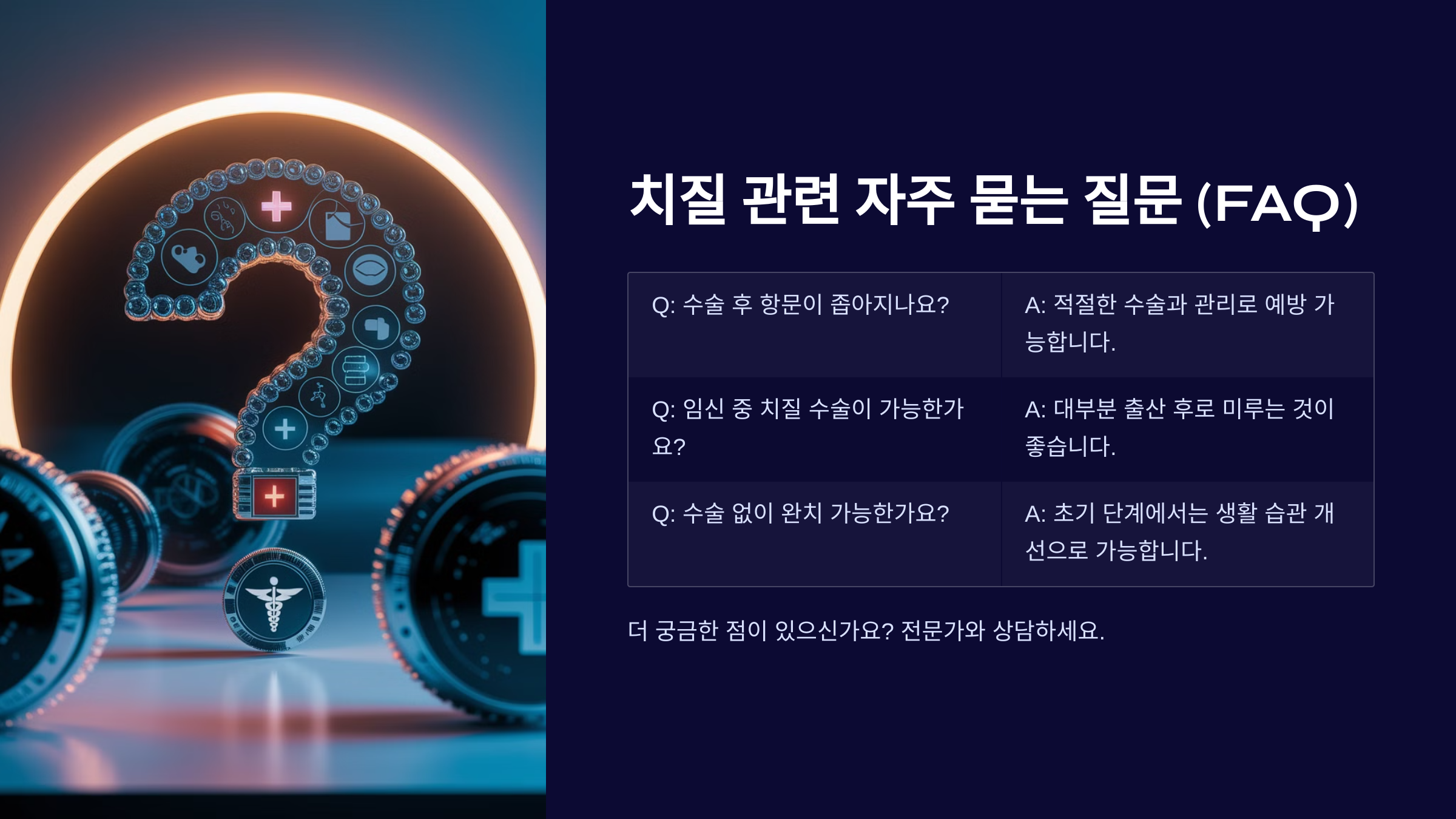 마지막으로, 치질과 관련된 자주 묻는 질문(FAQ)을 정리해봤어요! 궁금한 점이 있다면 다음 섹션을 확인해 주세요. ❓