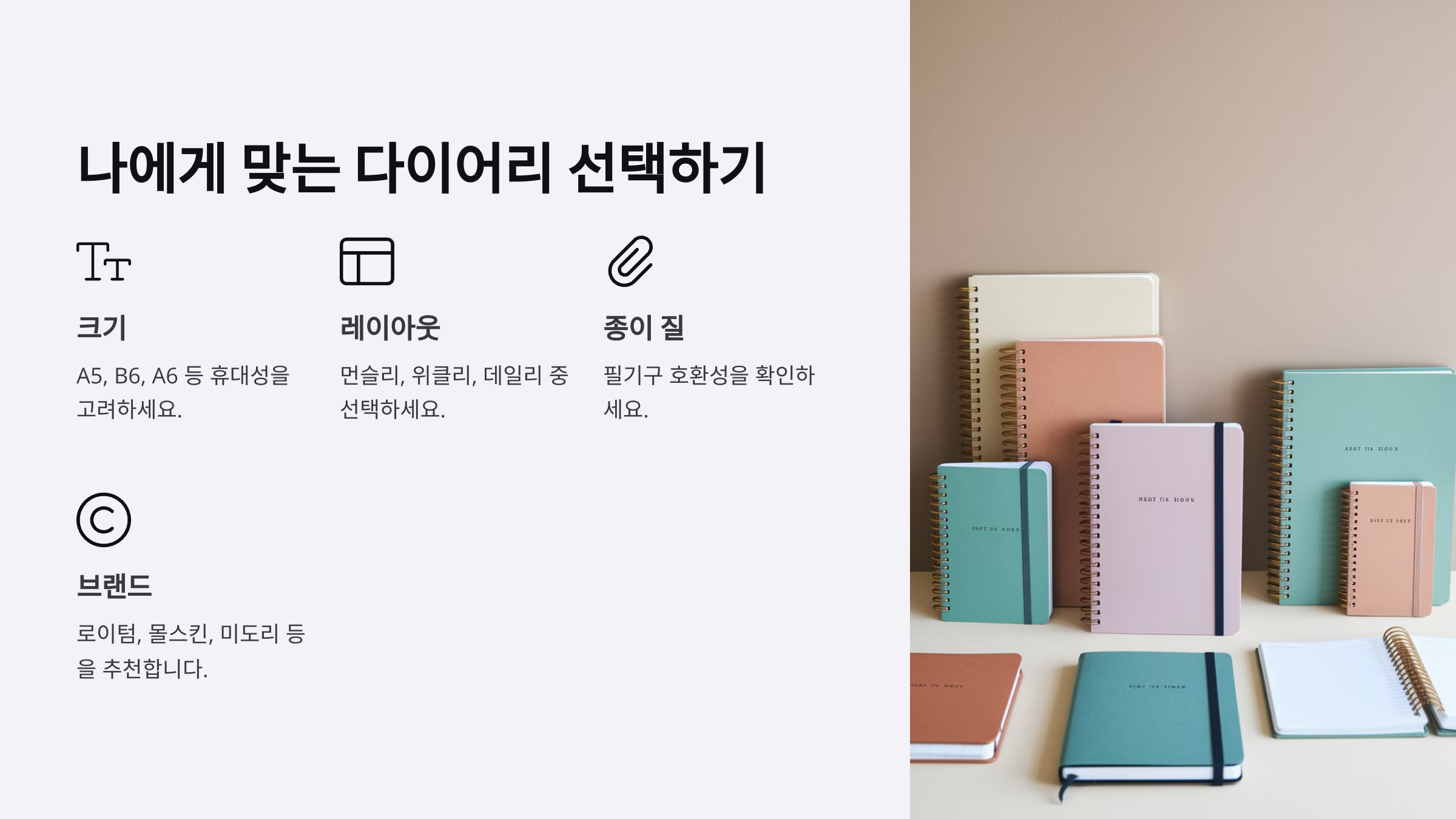 가장 기본적인 선택 기준은 **크기, 레이아웃, 제본 방식, 종이 질감**이에요. 크기는 휴대성을 고려해 A6~B6 사이즈가 인기가 많고, 책상 위에 두고 사용할 경우 A5 이상이 좋아요. 레이아웃은 **만년형, 날짜형, 주간형, 일간형** 등 다양해서 자신의 기록 스타일에 맞춰야 해요. 📅