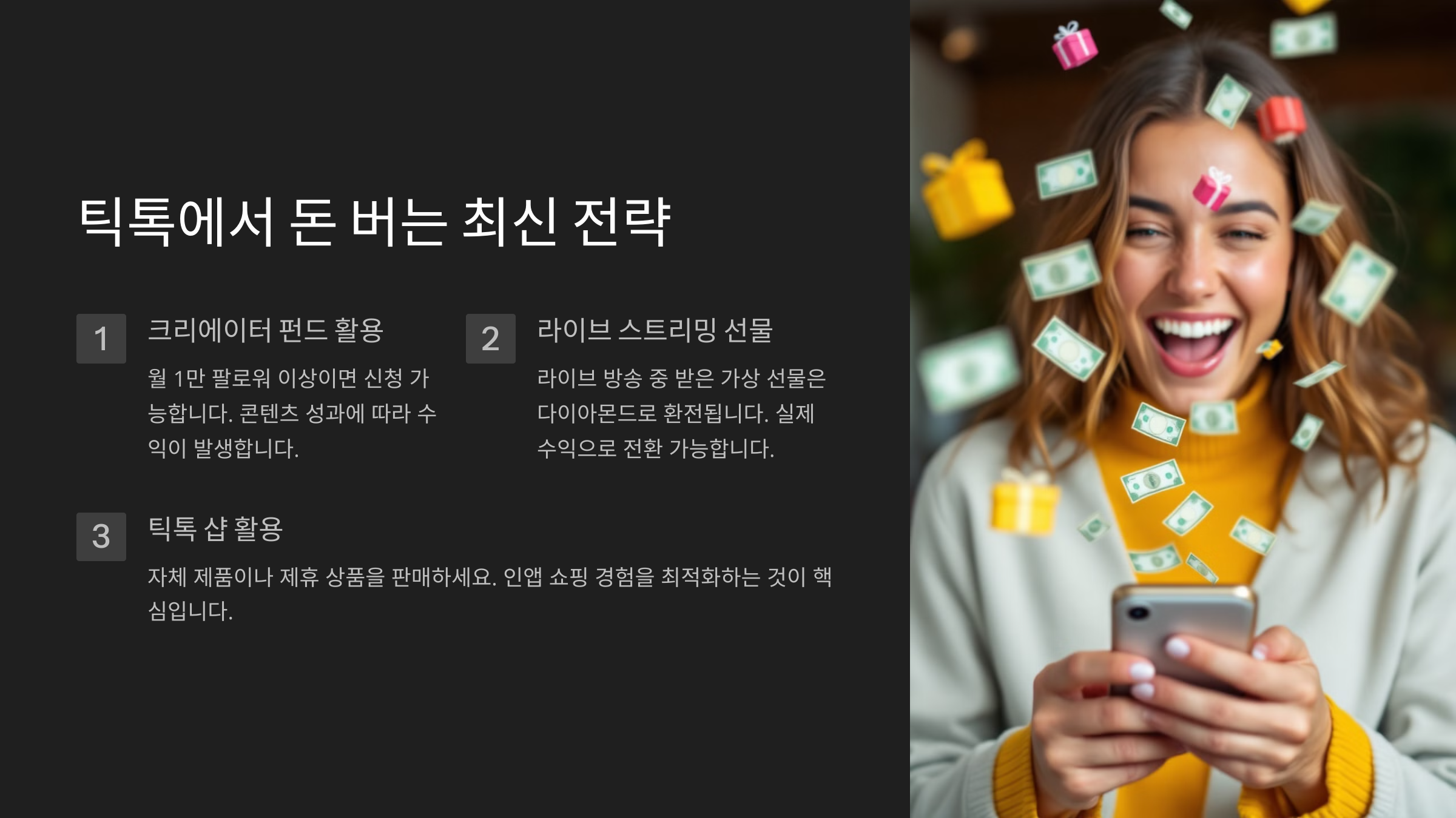 틱톡에서 수익을 얻는 대표적인 방법으로는 틱톡 크리에이터 펀드(TikTok Creator Fund), 브랜드 협업, 라이브 기프트, 그리고 자체 상품 판매가 있어요. 각 방법을 잘 활용하면 틱톡을 통해 안정적인 수익을 창출할 수 있어요.