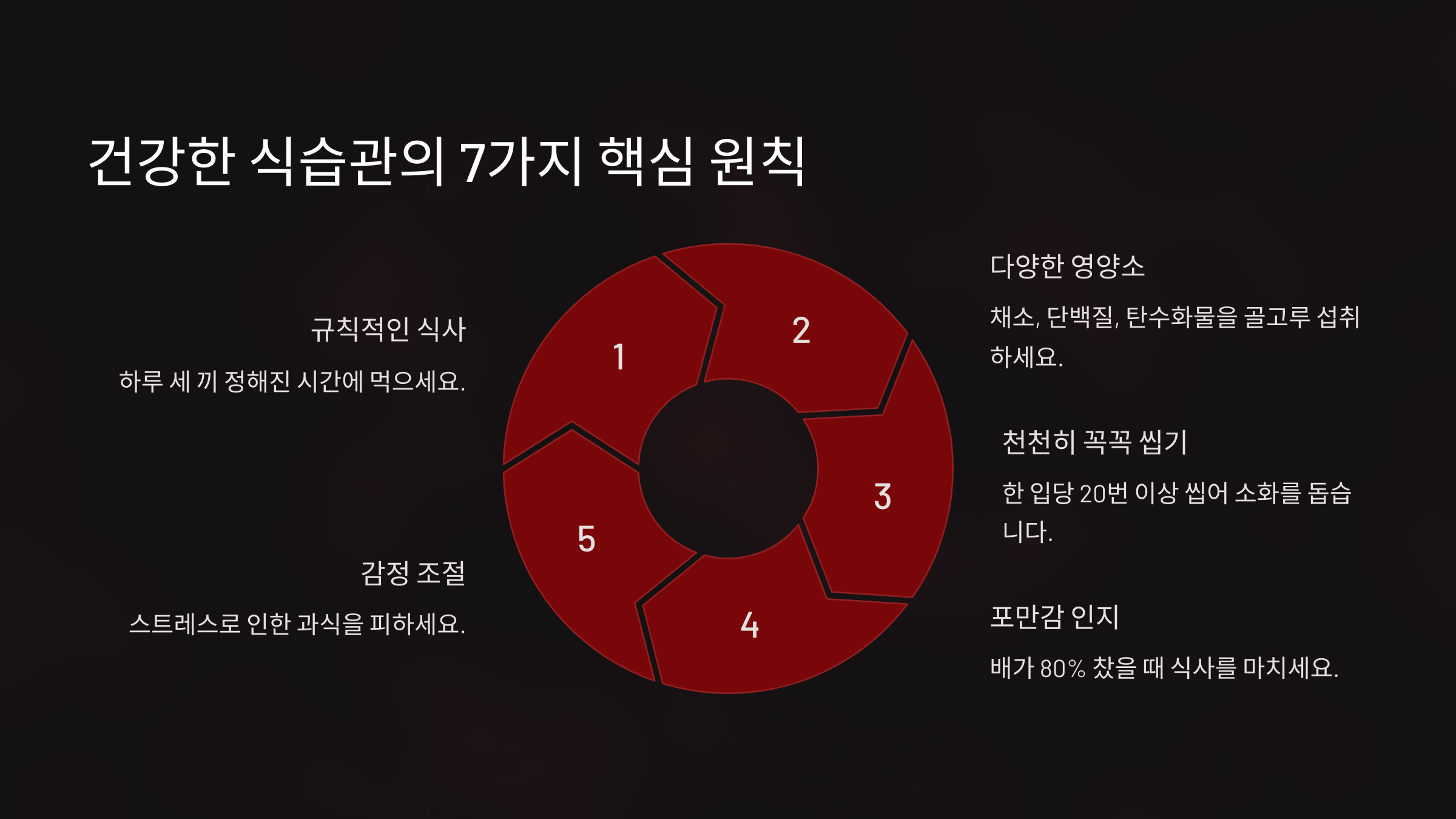 건강한 식습관은 하루아침에 만들어지는 것이 아니에요. 꾸준한 실천과 올바른 정보가 필요하죠. 다음의 7가지 원칙을 따르면 건강한 식습관을 형성하는 데 큰 도움이 될 거예요.