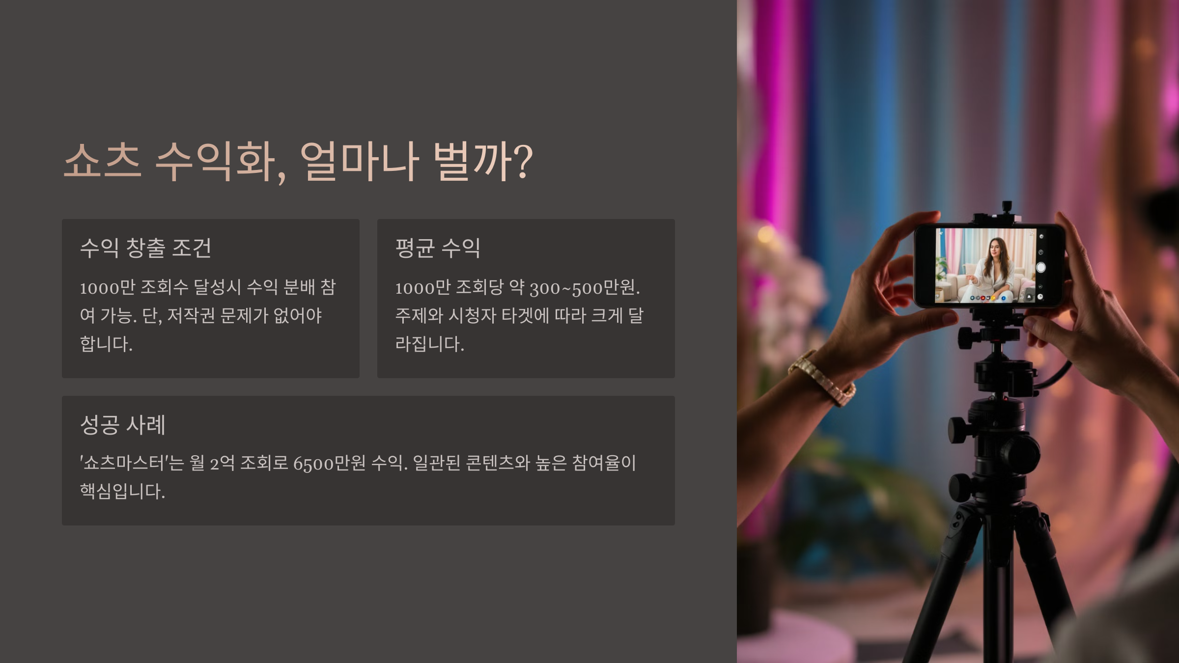 내가 생각했을 때, 쇼츠 수익화는 기존 롱폼 콘텐츠보다 수익성은 낮지만 빠르게 성장할 가능성이 높은 시장이에요. 짧고 재미있는 콘텐츠를 자주 올리면서 구독자 기반을 확보하면, 멤버십이나 협찬을 통한 추가 수익도 기대할 수 있어요. 🚀