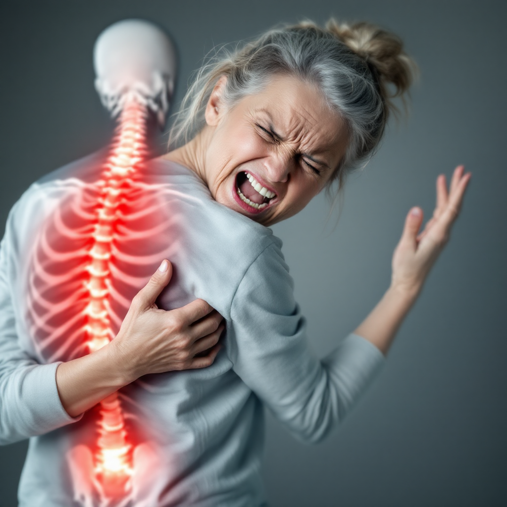 하지만 골다공증이 어느 정도 진행되면 뼈가 약해진 탓에 다양한 증상이 나타나기 시작해요. 가장 대표적인 것이 '척추압박골절'이에요. 외상이 없었는데도 갑자기 등이 굽거나, 키가 줄어드는 경우가 많아요. 이건 척추 뼈가 찌그러져서 발생하는 현상이에요.