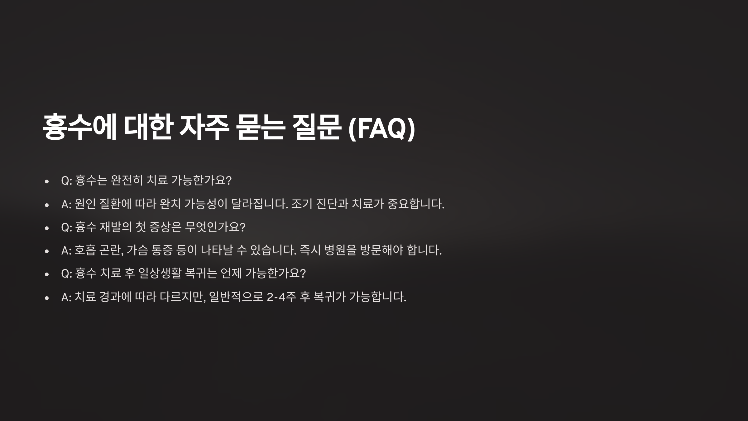 이제 흉수에 대한 궁금증이 많이 풀리셨을 거예요! 😊 흉수는 조기에 발견하고 적절히 치료하면 건강을 유지할 수 있으니, 꾸준한 관리와 예방이 가장 중요하답니다.