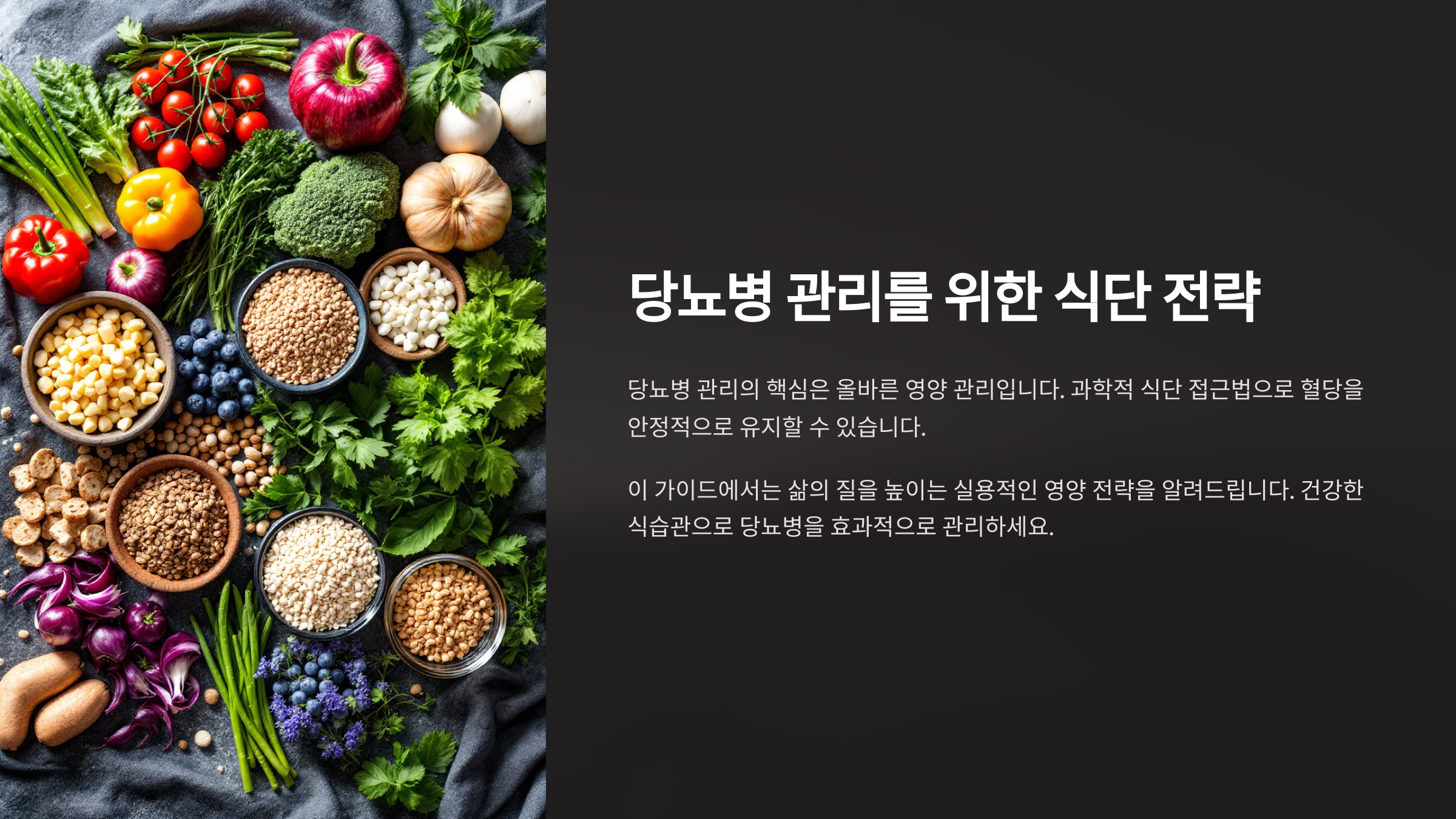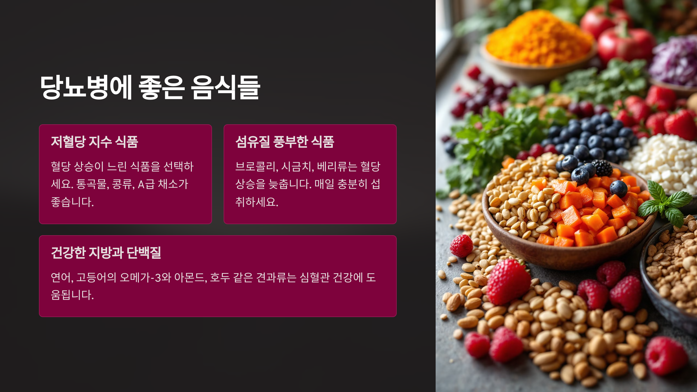 당뇨병 환자에게 가장 중요한 건 바로 '혈당 조절'이에요. 이를 위해서는 혈당을 천천히 올리는 저혈당지수(GI) 식품을 섭취