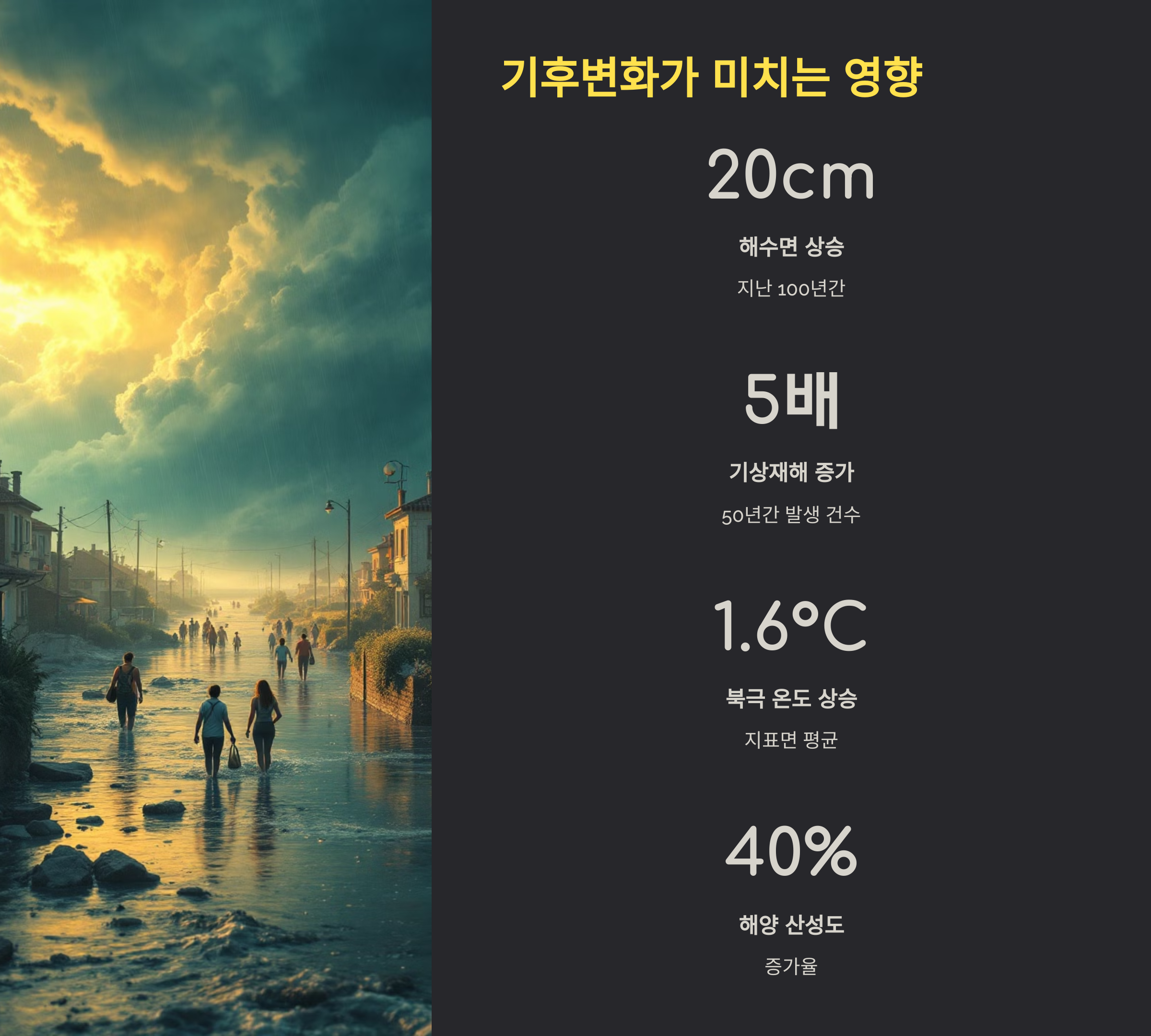 자, 그럼 다음은 이 변화가 실제로 어떤 영향을 주는지 살펴볼게요. 각종 자연재해, 경제 위기, 식량 부족까지... 기후변화는 현실이에요.