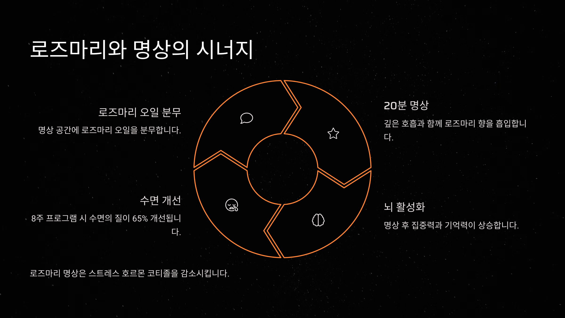 | 기상 직후 | 로즈마리 향 깊게 흡입 | 두뇌 활성화, 집중력 UP |