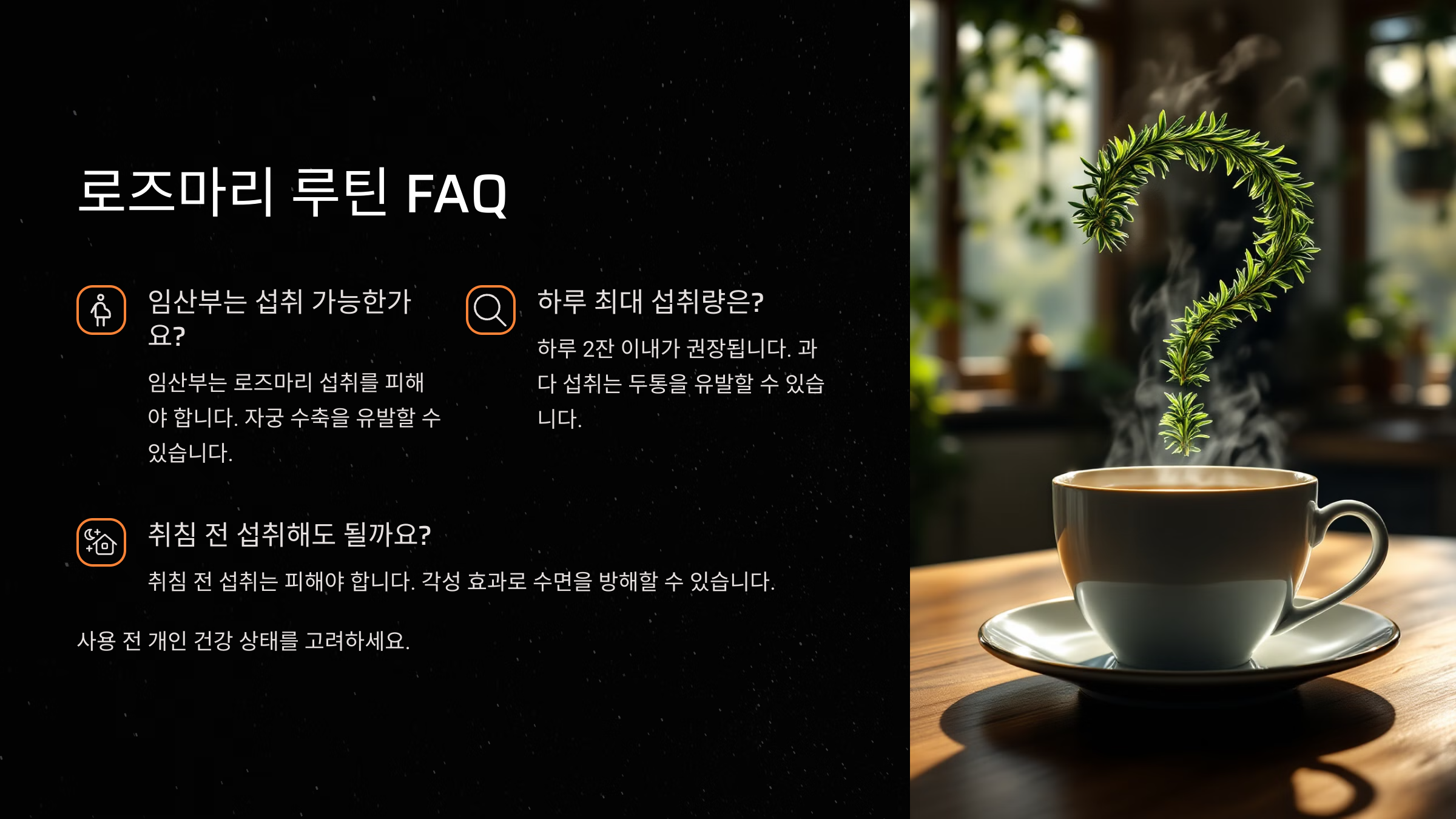 로즈마리는 허브라서 비교적 안전한 편이지만, 과도하게 사용하면 오히려 두통이나 위장장애 같은 부작용이 생길 수 있어요. 그래서 적절한 섭취량과 사용 시간을 지키는 게 중요해요.