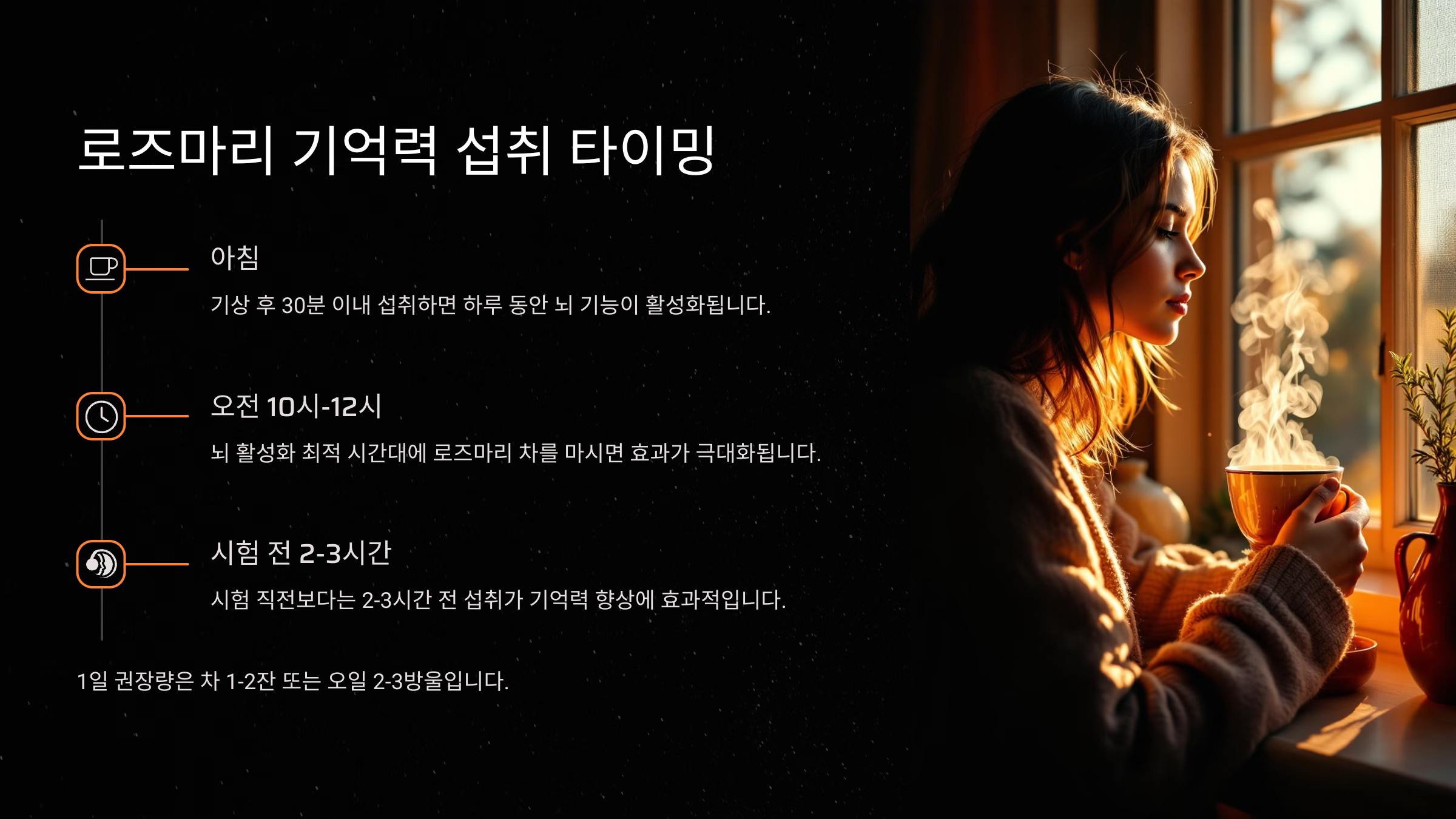 | 오전 10시 | 로즈마리차 | 집중력 유지 |