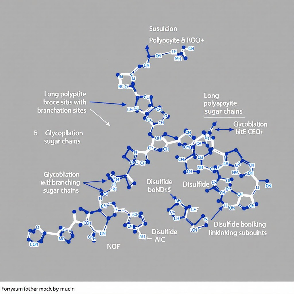 뮤신은 단백질과 당분이 결합된 고분자 구조를 가지고 있어요. 특히 '글리코단백질'이라는 형태인데, 전체 분자량 중 상당 부분이 탄수화물로 이루어져 있다는 점이 특징이에요. 그래서 끈적끈적한 점성이 나타나는 거죠!