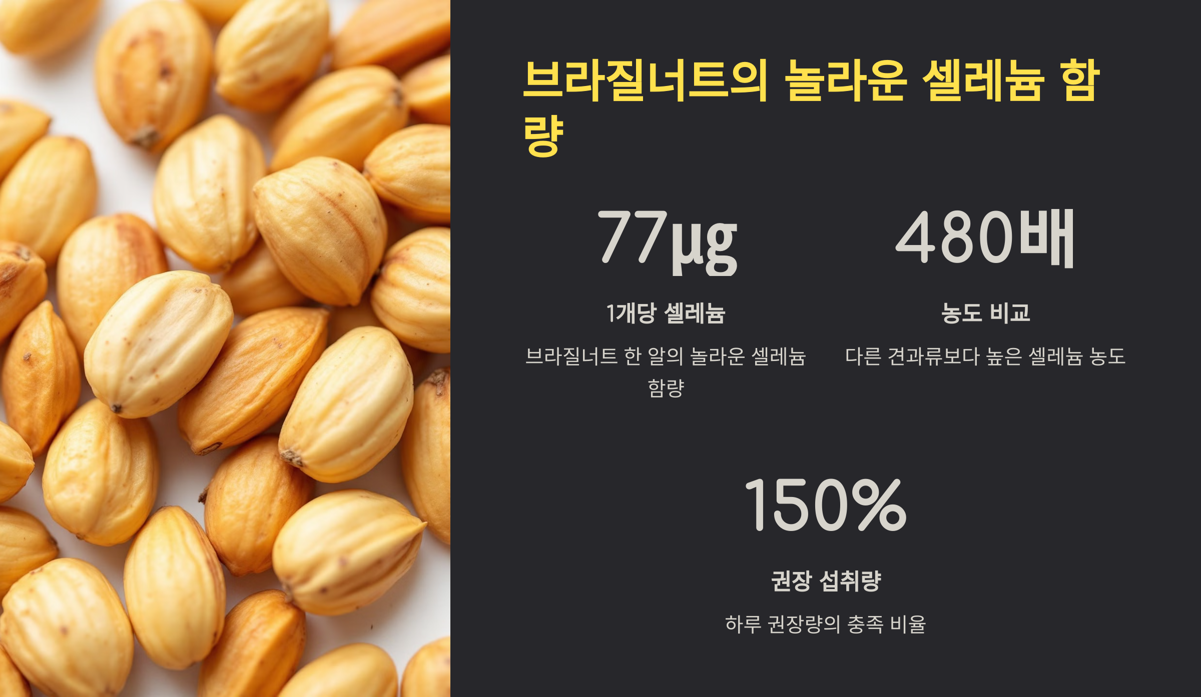 하지만 정제된 셀레늄 보충제보다 브라질너트에서 얻는 천연 셀레늄이 더 효과적이라는 점, 꼭 기억하세요! 흡수율도 높고 부작용도 적어요.