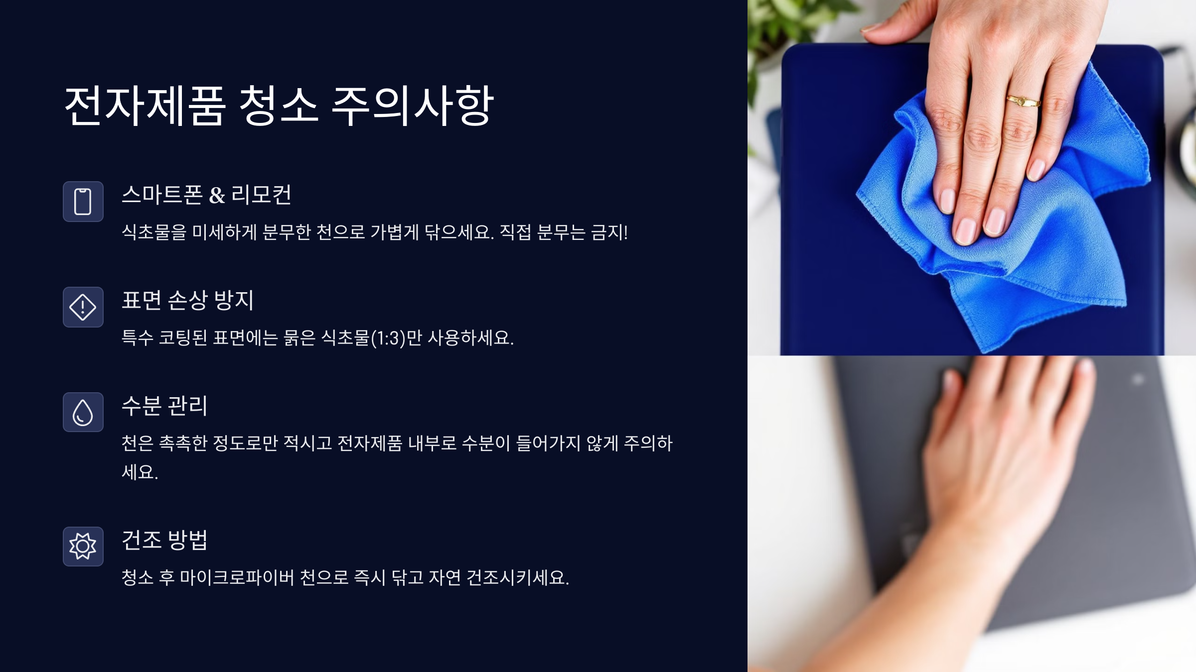 특히 스마트폰이나 태블릿 같은 민감한 기기에는 식초 대신 전용 세정제를 사용하는 게 더 좋아요. 식초는 산성이 강해서 코팅이 벗겨질 수 있거든요. 전자제품은 기능 손상이 일어나기 쉽기 때문에 가능한 한 안전한 방법을 선택해 주세요!