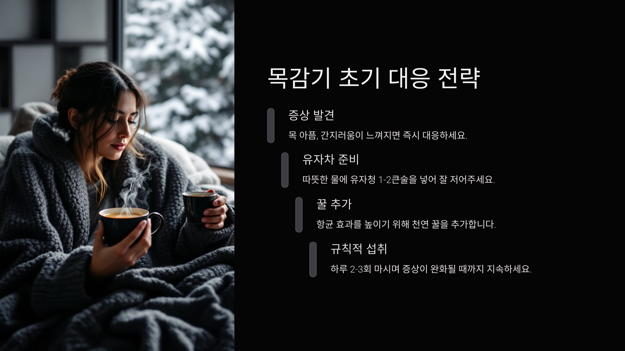 다음 문단에서는 유자차가 목감기 초기 증상에 어떻게 작용하는지 알려줄게요! 🚨