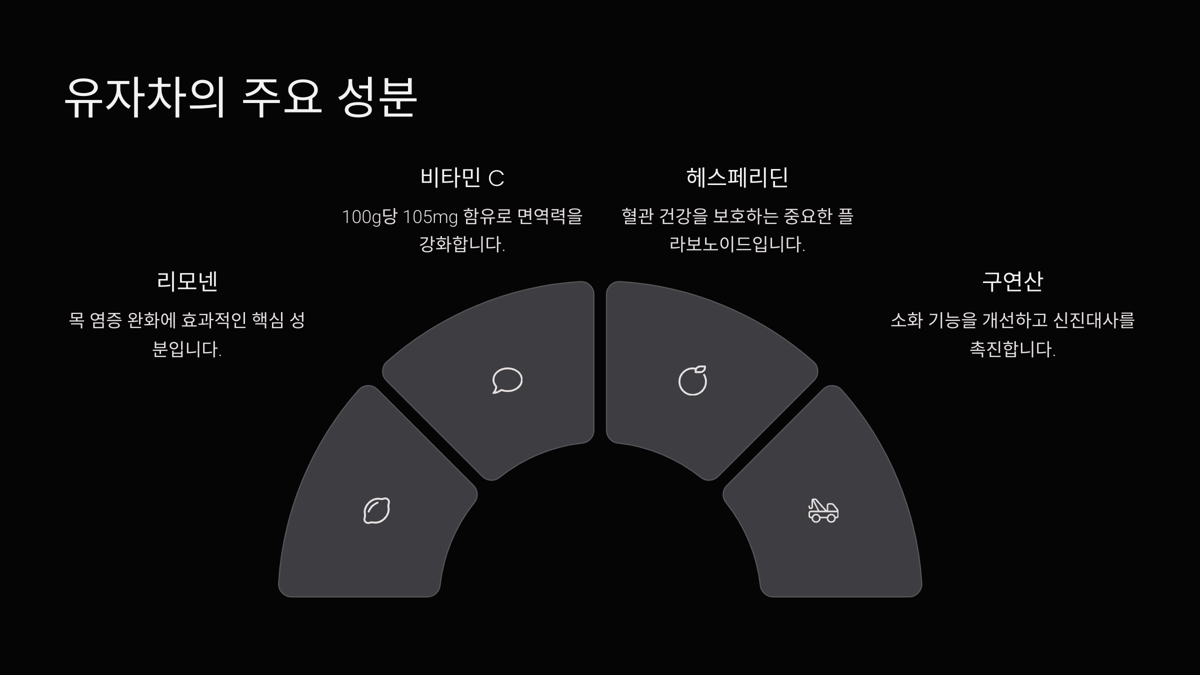 이런 작용 덕분에 유자차는 단순한 감기 예방 음료가 아니라, 인후염이나 편도염 초기 증상에도 효과적이에요. 목을 많이 사용하는 사람, 잦은 통증에 시달리는 사람들에겐 정말 고마운 음료라 할 수 있죠!