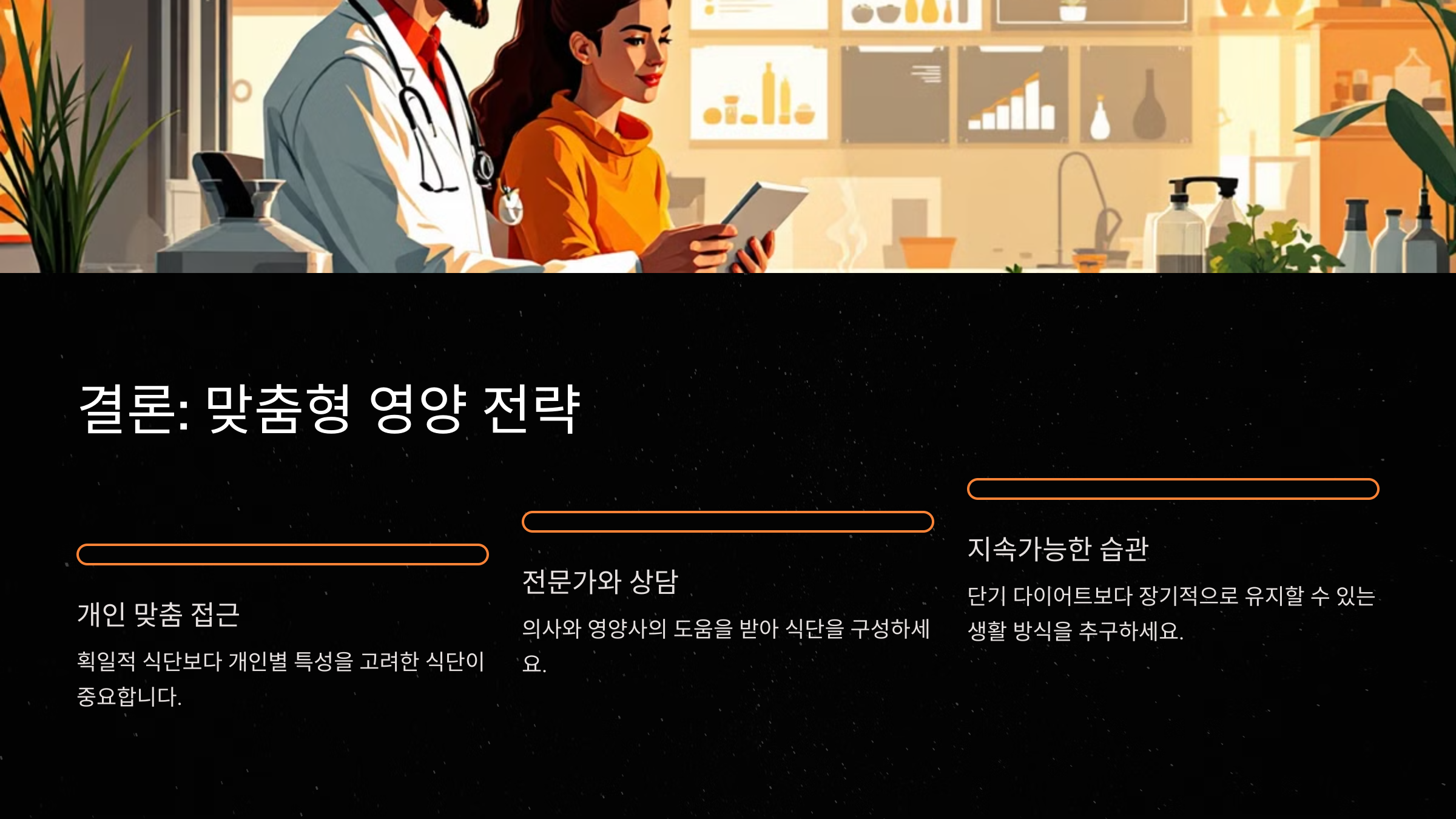 마지막으로, 극단적인 탄수화물 제한은 추천하지 않아요. 현미, 고구마 같은 복합 탄수화물은 소량이라도 포함시키는 게 좋아요. 이런 식단은 몸이 지속적으로 유지할 수 있어야 의미가 있어요. 지속가능성이 핵심이에요!