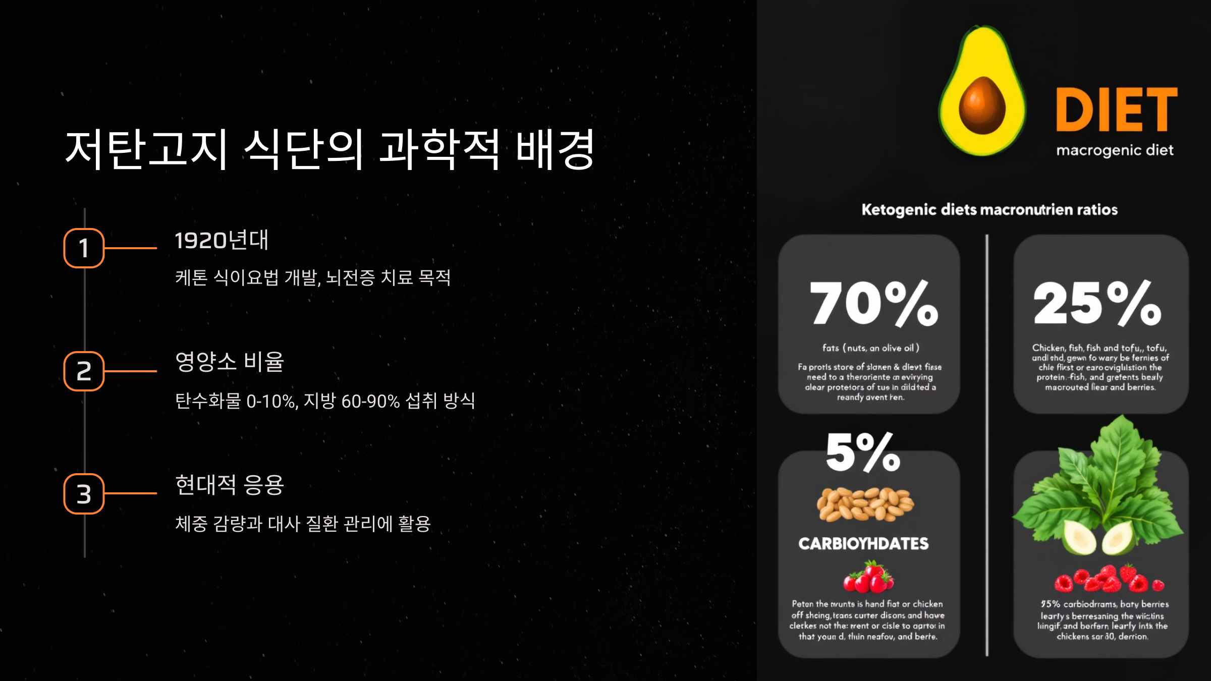 저탄고지, 즉 저탄수화물 고지방 식단은 최근 몇 년간 큰 인기를 끌고 있어요. 원래는 간질 치료를 위해 개발된 식단인데, 체중 감량 효과가 알려지면서 대중화되었죠. 이 식단의 핵심은 탄수화물을 극단적으로 줄이고, 지방 섭취를 늘려 몸을 '케토시스' 상태로 전환시키는 거예요. 케토시스는 체내 탄수화물이 부족할 때 지방을 연료로 사용하는 상태예요.