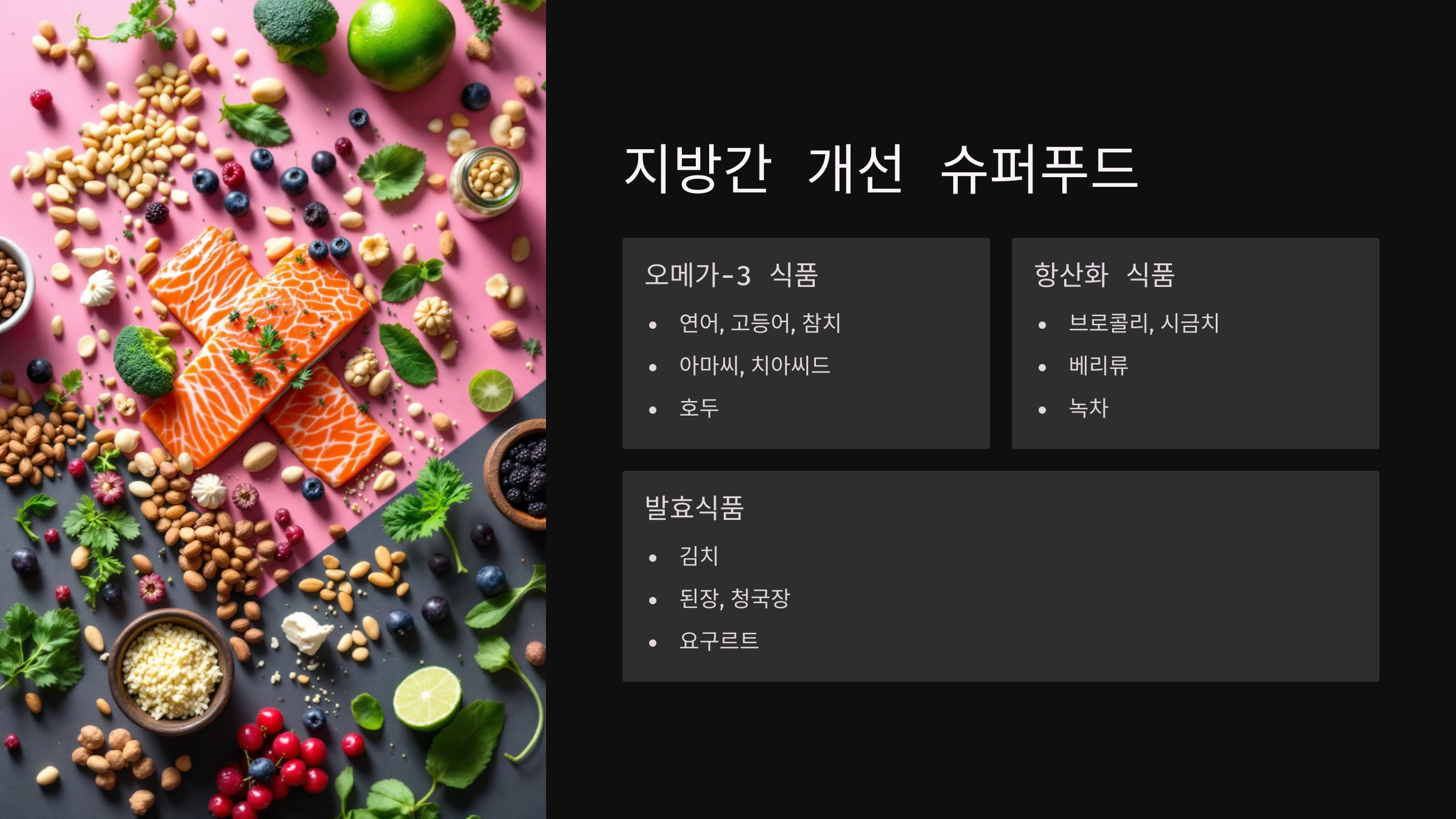 지방간을 이기는 데 가장 든든한 아군이 바로 ‘슈퍼푸드’들이에요. 이름만 들어도 건강해지는 느낌 들죠? 😊 이 슈퍼푸드들은 항산화 성분, 해독 효소 촉진, 지방 대사 촉진 등 간에 꼭 필요한 역할을 해줘요. 식단 속에 잘 녹여서 꾸준히 섭취하면 간 기능 향상에 큰 도움을 줄 수 있어요.