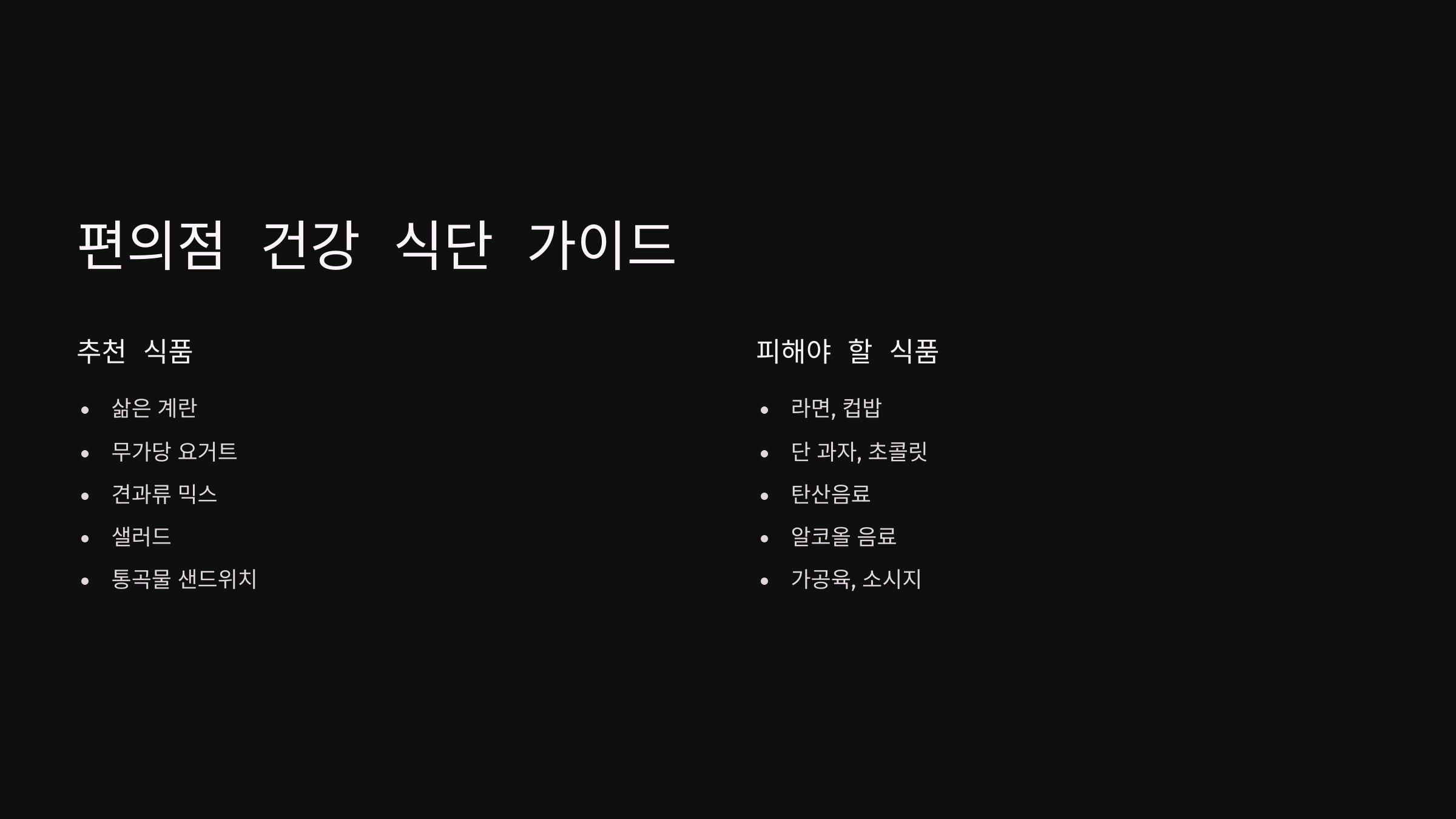 | 닭가슴살 스낵 | 고단백, 저염 | 포만감 유지 |