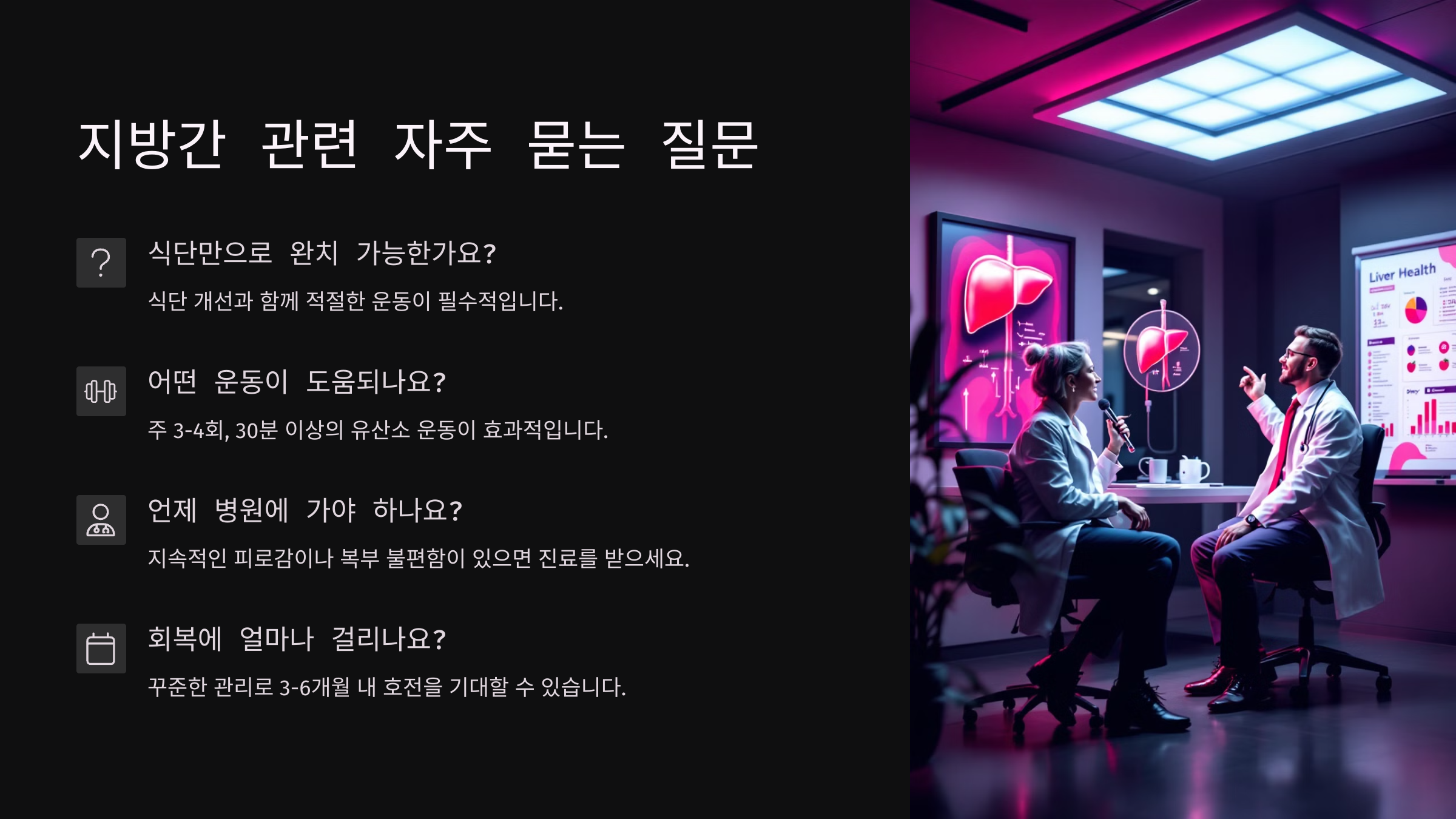 지금까지의 내용을 정리해보면, 지방간은 절대 무서운 병이 아니에요. 관리만 잘하면 충분히 되돌릴 수 있어요. 마지막으로 많은 분들이 궁금해하는 지방간 관련 질문들을 FAQ에서 한 번 정리해볼게요!📚