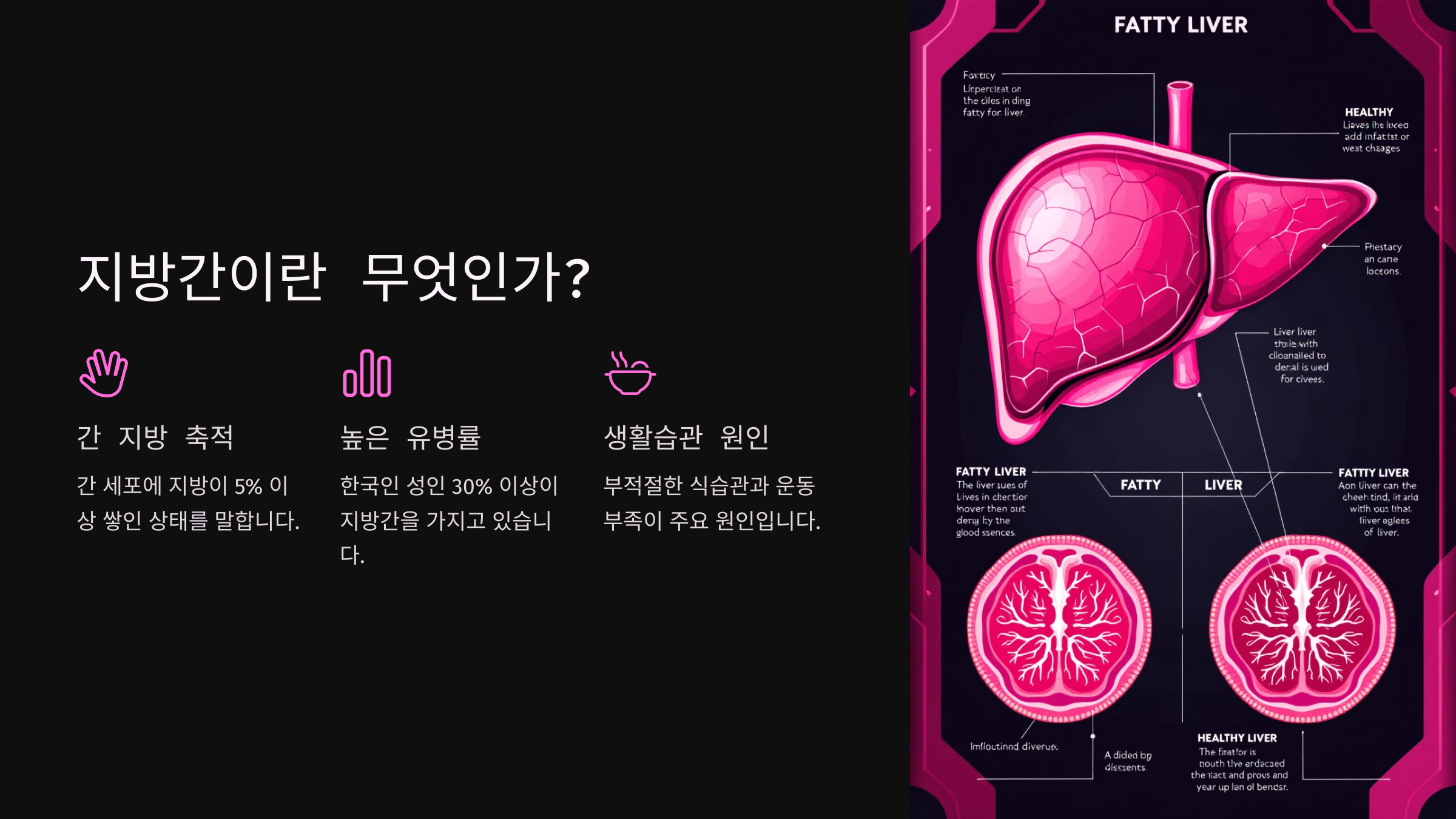 특히 간은 해독 기능을 담당하니까, 이런 인공 성분이 많은 음식들을 계속 먹으면 간세포가 손상될 수 있어요. 손상된 간세포는 지방을 잘 분해하지 못하고 점점 기능이 떨어지게 돼요. 그 결과 간은 본연의 역할을 못하게 되고, 건강에 빨간불이 켜지는 거예요.