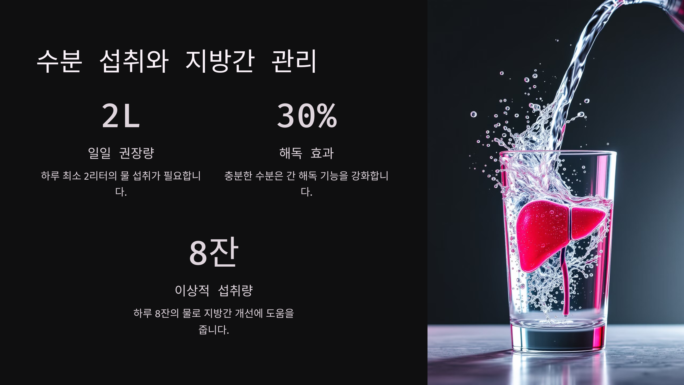 다음은 ‘물’에 대한 이야기를 해볼게요. 물이 지방간에 미치는 영향, 생각보다 훨씬 커요. 다음 섹션에서 자세히 다뤄볼게요!
