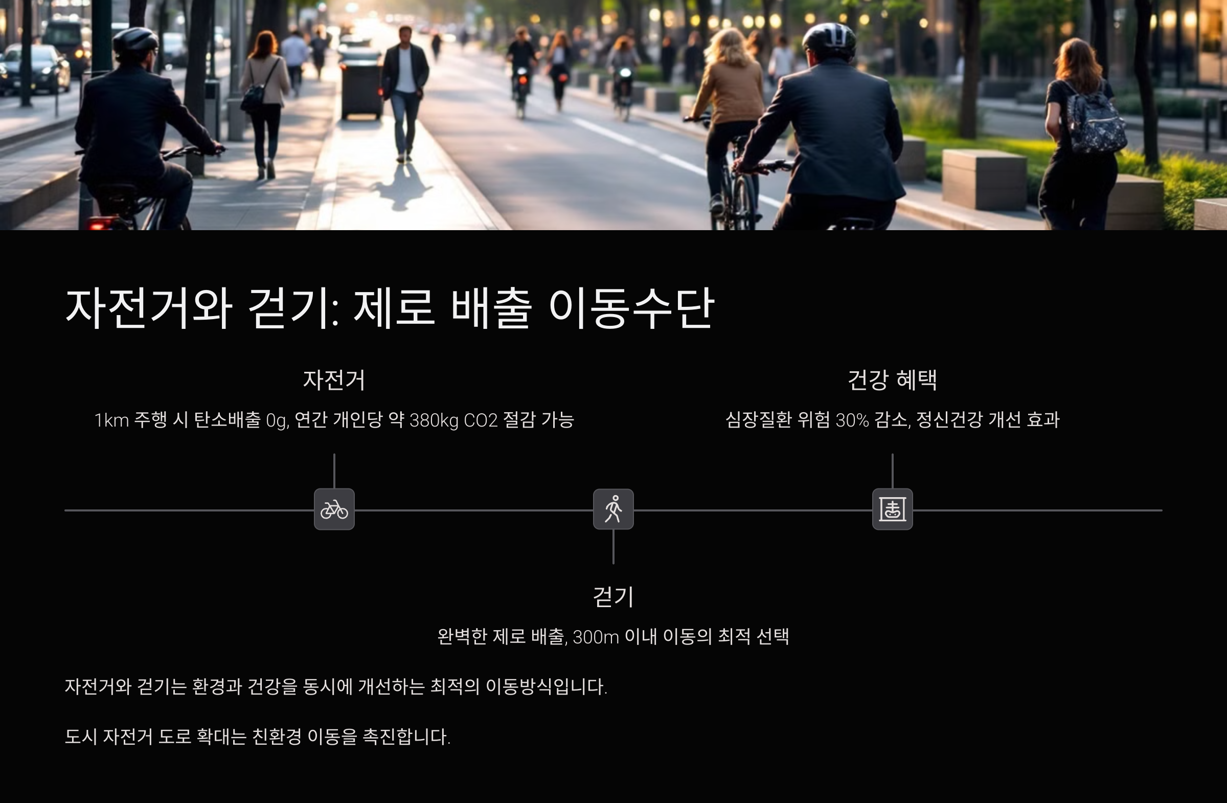 | 도보 출근 | 직장 인근 거주 시 걷기 | 무탄소, 건강에 좋아요 |