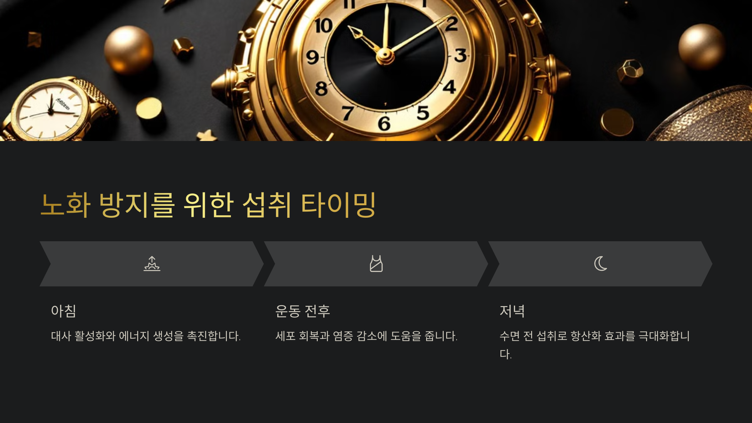 이제 이어서 🕒 '노화 방지를 위한 섭취 타이밍'에 대해 설명할게요! 바로 아래에서 확인해요 👇