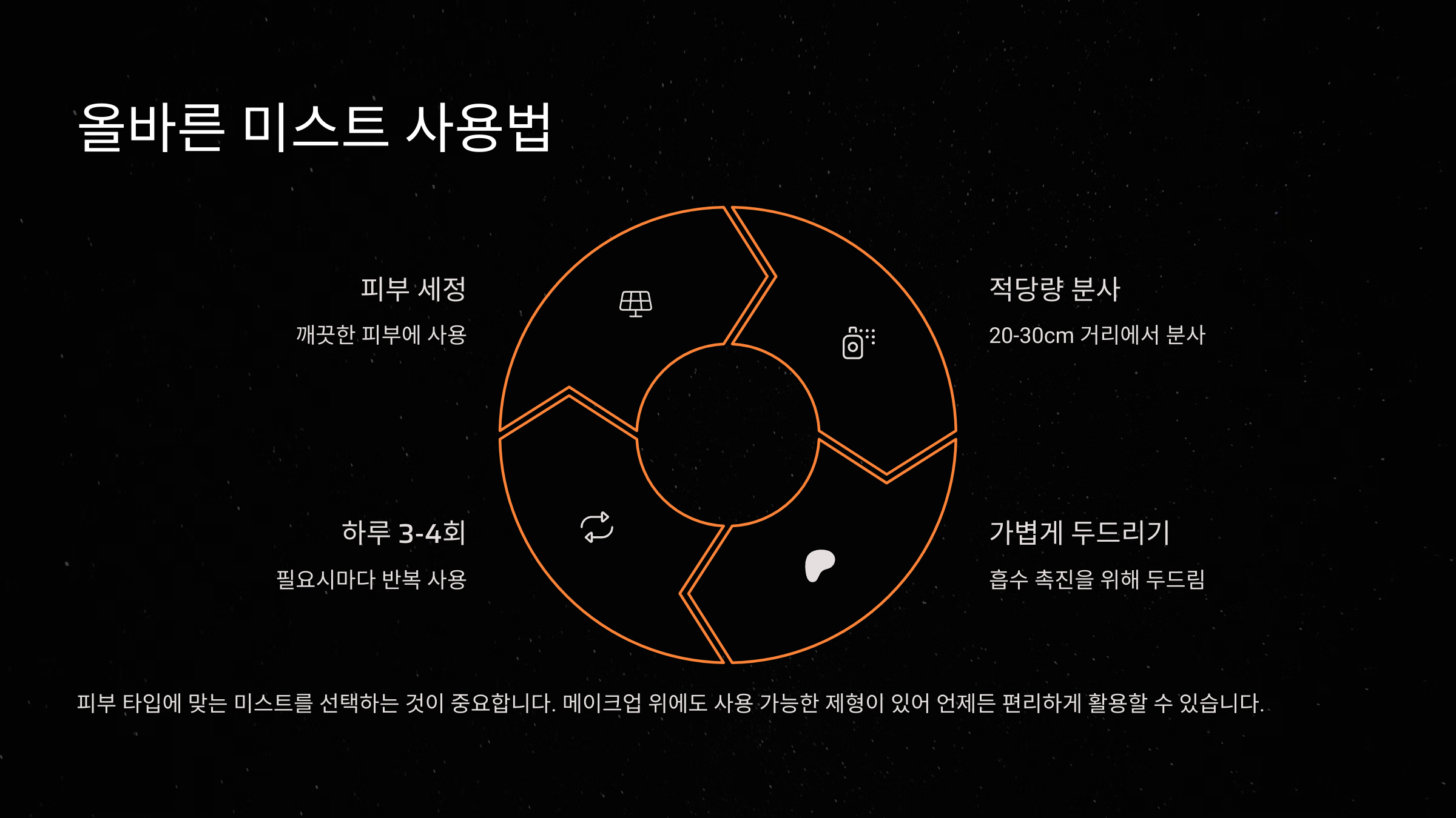 그렇다면 이 좋은 습관을 어떻게 ‘자연스럽게’ 이어갈 수 있을까요? 정답은 ‘루틴화’예요. 미스트를 그냥 사용하는 게 아니라, 내 삶 속에 자동으로 스며들게 만들어야 해요. 이를테면, 잠자기 전 침대에 앉으면 자동으로 미스트를 찾게 되는 그런 흐름 말이에요.